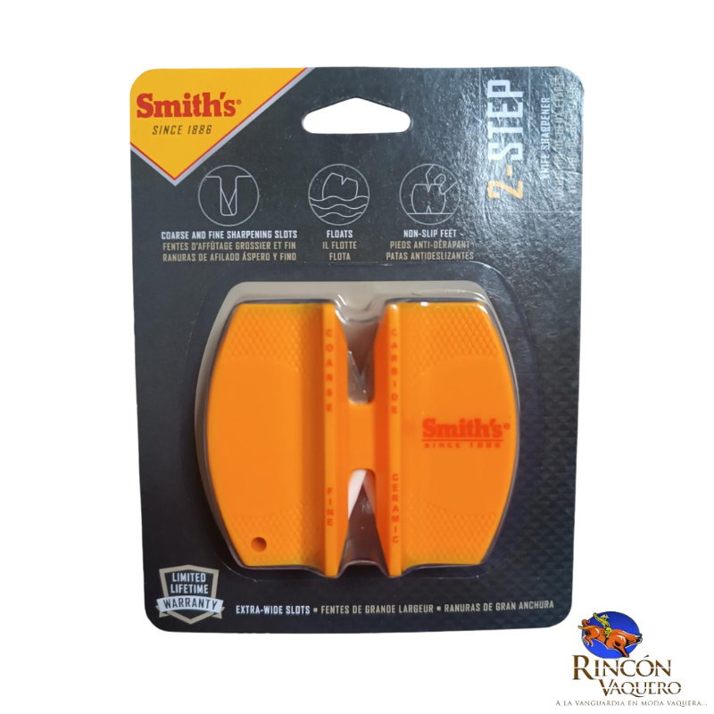 Afilador Smith's 2‑Step: dos etapas (carburo y cerámica), portátil con agujero para cordón y base antideslizante; ángulo de 20° para un filo perfecto