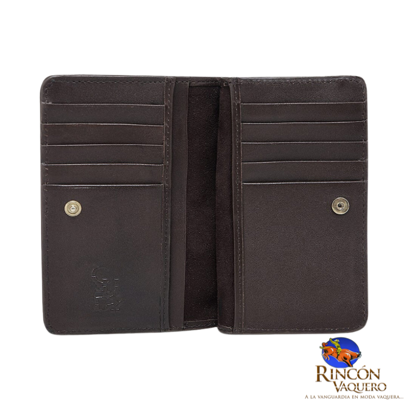 Billetera para dama en piel genuina de venado y piel de bovino. Al frente presenta aplicación metálica de logotipo Cuadra. En su interior cuenta con diez espacios para tarjetas y tres espacios para efectivo. Asegurada con broche. En la parte trasera presenta un compartimento con dos divisiones y cierre.