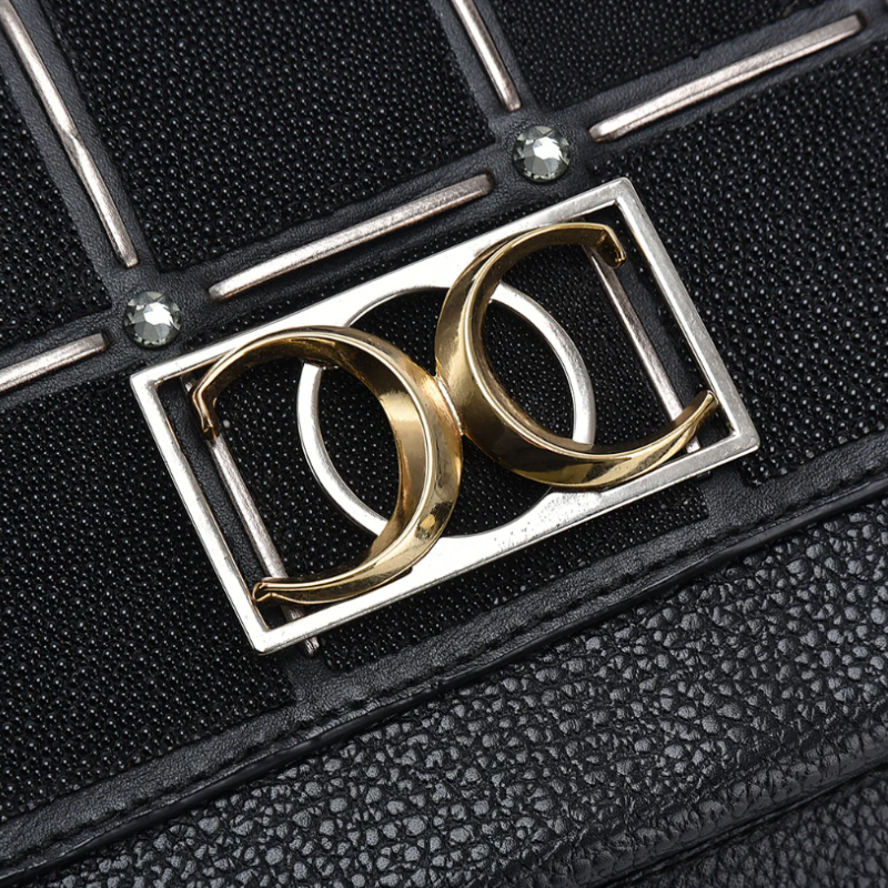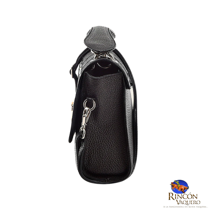 Bolso de mano para dama en piel genuina de mantarraya. Aplicación metálica de monograma Cuadra en color oro y plata. Con aplicaciones metálicas y estoperoles en la parte frontal. Asa corta y un asa larga desmontable. Cuenta con compartimento externo asegurado con cierre y tres compartimentos internos uno de ellos asegurado con cierre. Color negro. Las marcas y cicatrices que puede presentar lejos de ser considerados como defecto demuestran la autenticidad de cada producto.