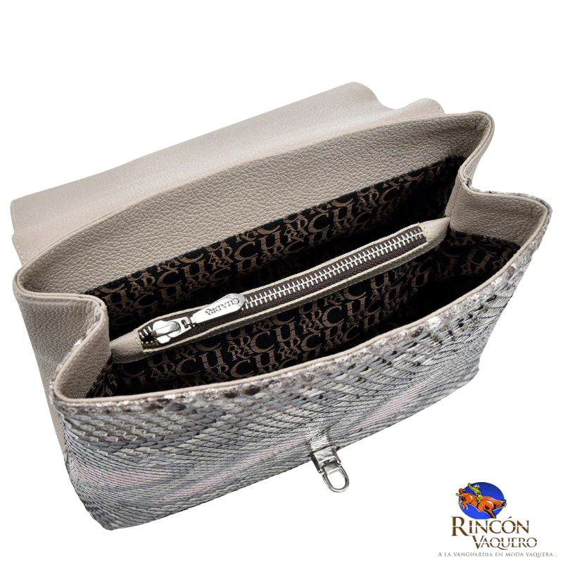 Bolso crossbody para dama en piel genuina de pitón color natural con detalles en rosa. Con herrajes metálicos. Asa de cadena y piel genuina de pitón ajustable. Color gris.