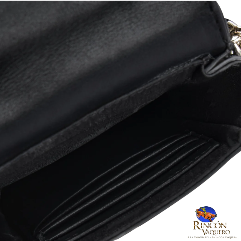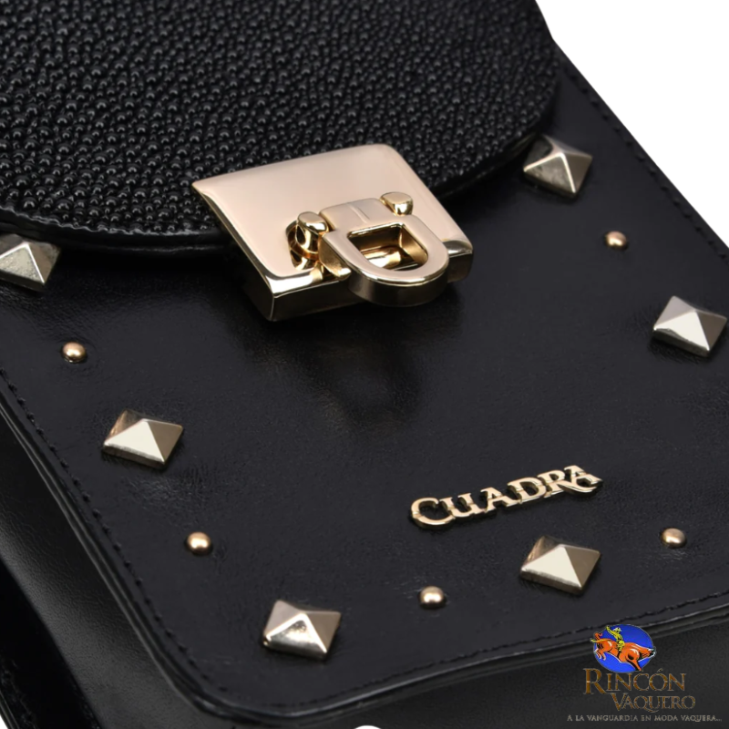 Porta celular para mujer en genuina piel de mantarraya y bovina. En la parte delantera presenta estoperoles y aplicación metalizada del logo de Cuadra. Asegurado con broche de metal y aplicación de imanes. En su interior tiene cuatro espacios para tarjetas. Incluye una correa larga.