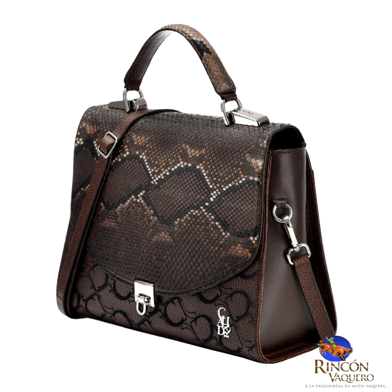 Bolso de mano para dama en piel genuina de pitón. Cuenta con dos compartimentos internos, uno de ellos ajustado con cierre y un compartimento externo en la parte trasera. Asa de mano y Asa larga ajustable y desmontable. Con monograma Cuadra en la parte frontal. Ajuste con broche. Color miel.