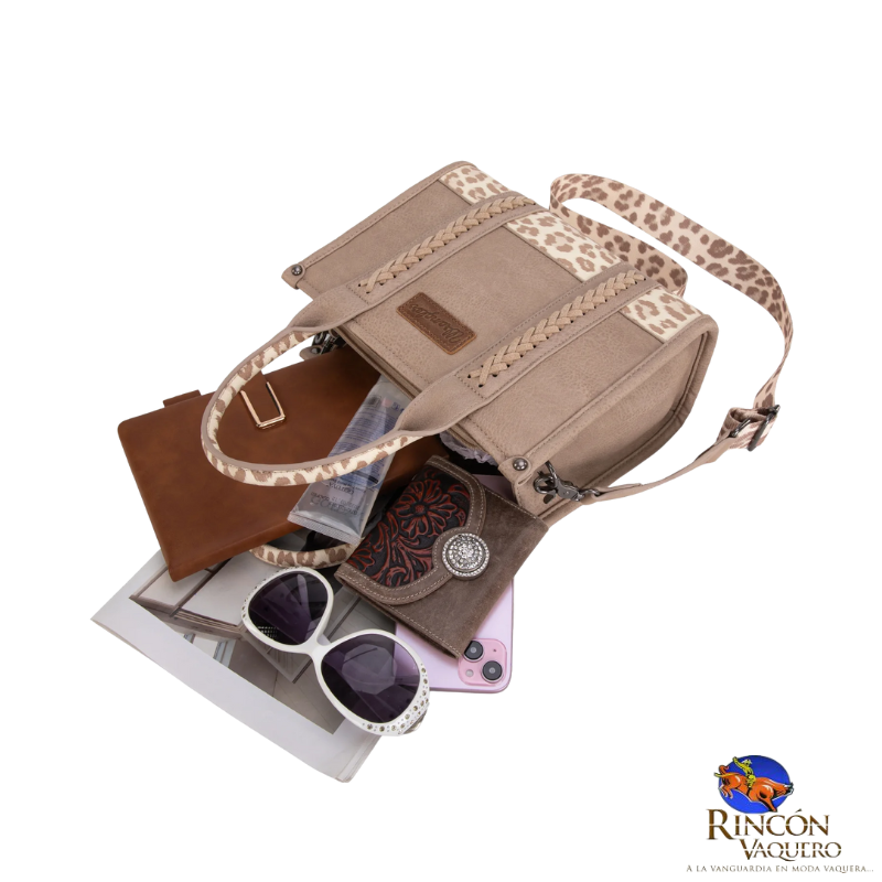Modelo: WG102-8120SLP-TN. Fabricado en piel sintética, este bolso bandolera tiene: Detalles de puntada de látigo. Aplique del logotipo de Wrangler en la parte delantera. Estampado de leopardo. Cierre de cremallera superior. El interior del bolso incluye un bolsillo con cremallera y un bolsillo abierto. Un bolsillo con cremallera en la parte posterior para ocultar la pistola (9" x 5"). Asa redonda doble con ribete de leopardo (Caída: 5,5"). Correa cruzada ajustable y desmontable incluida. 11" X 5" X 9" (Correa cruzada 46").