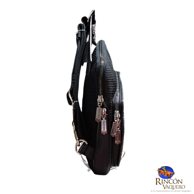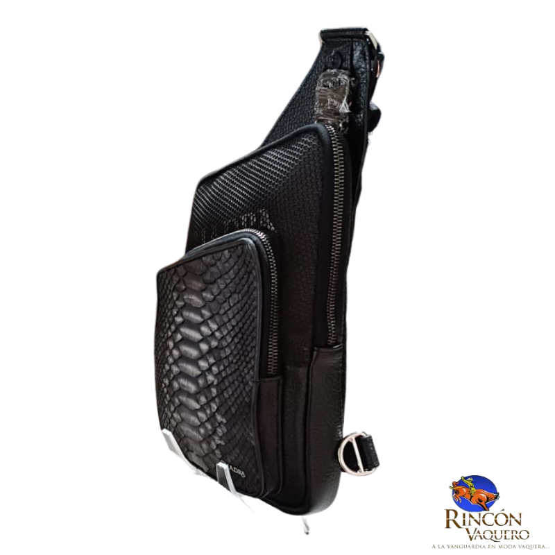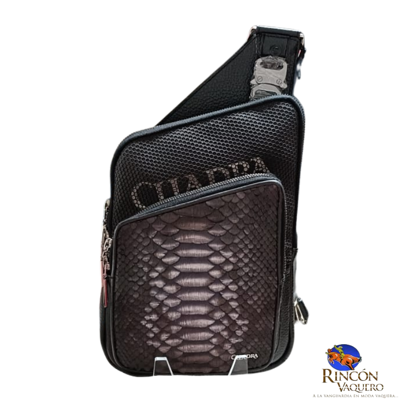 Bandolera para caballero en piel genuina de pitón y piel de bovino. Al frente presenta aplicación metálica del logotipo y logotipo Cuadra encapsulado bajo KPU micro inyectado en motivos geométricos. Cuenta con dos compartimentos asegurados con cierre, el compartimento de mayor tamaño cuenta con cuatro espacios para tarjetas. La parte trasera cuenta con malla textil transpirable y asa textil ajustable asegurada con broche.