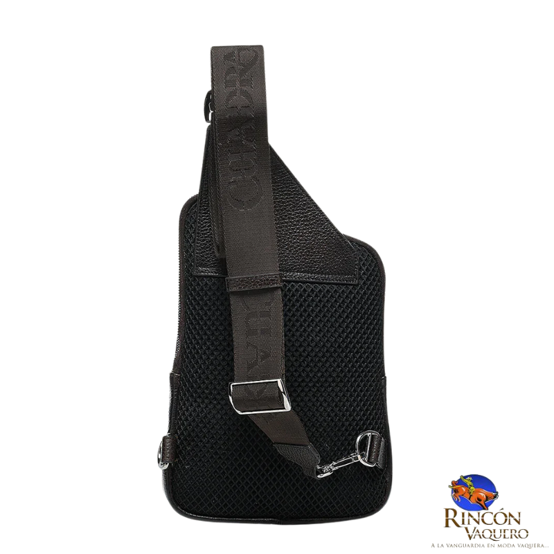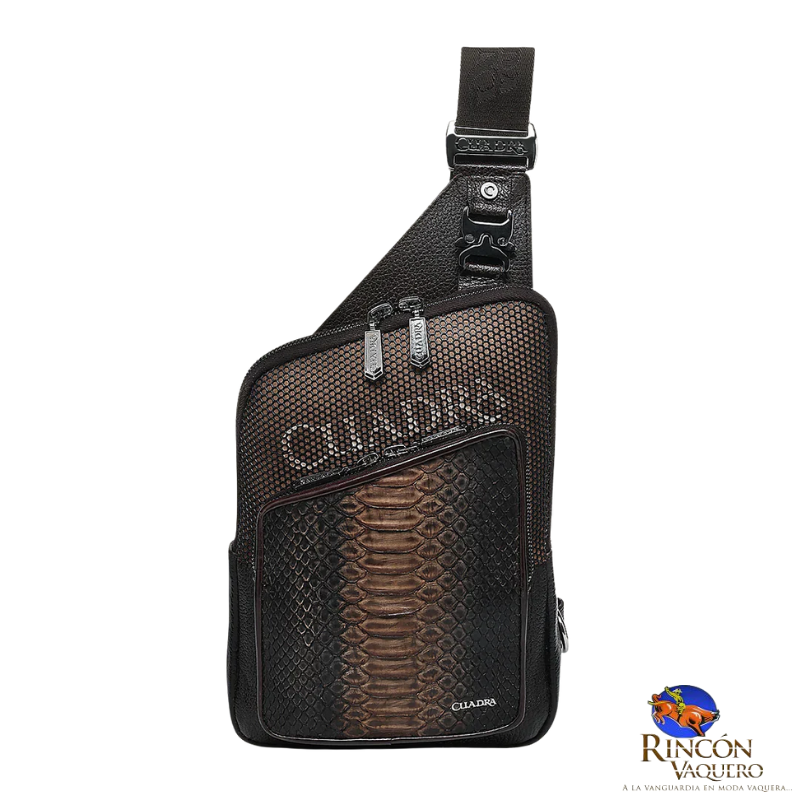 Bandolera para caballero en piel genuina de pitón y piel de bovino. Al frente presenta aplicación metálica del logotipo y logotipo Cuadra encapsulado bajo KPU micro inyectado en motivos geométricos. Cuenta con dos compartimentos asegurados con cierre, el compartimento de mayor tamaño cuenta con cuatro espacios para tarjetas. La parte trasera cuenta con malla textil transpirable y asa textil ajustable asegurada con broche.