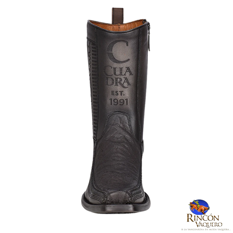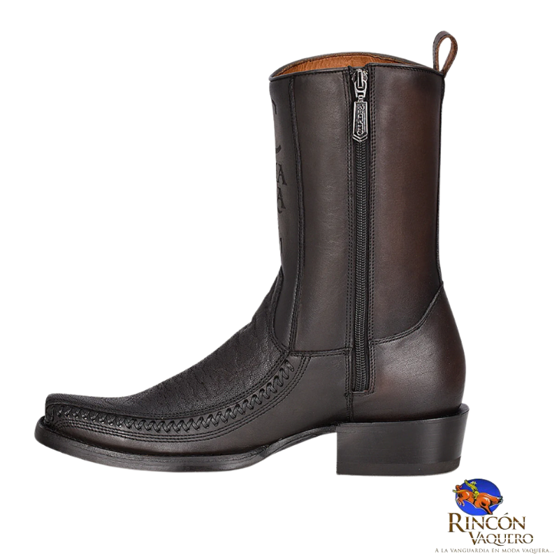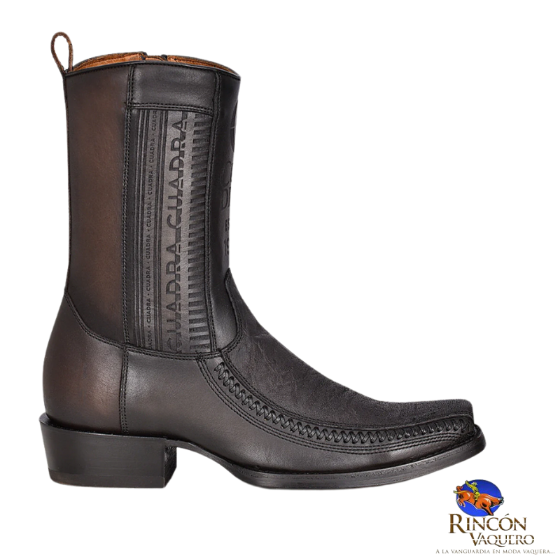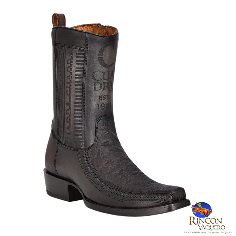 Bota casual para caballero en piel genuina de elefante y piel de bovino. Presenta grabado láser de logotipo Cuadra al frente y en los costados y detalles de tejido artesanal que enmarcan la piel de elefante. Ajustada con cierre interno. Con suela de cuero con injerto de TPU. Las marcas y cicatrices que puede presentar lejos de ser considerados como defecto demuestran la autenticidad de cada producto.