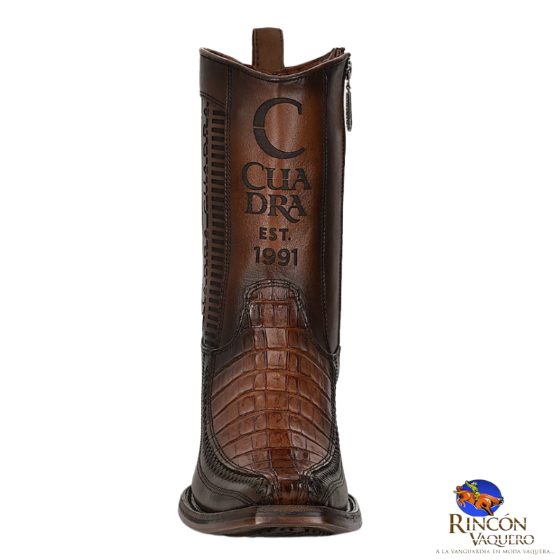 Bota para caballero en piel genuina de fuscus y piel de bovino. Sobre el tubo presenta grabado láser de logotipo Cuadra. Con detalles de tejido artesanal en los costados, que enmarcan la piel de fuscus. Ajustada con cierre interno. Con suela de cuero con injerto de TPU.