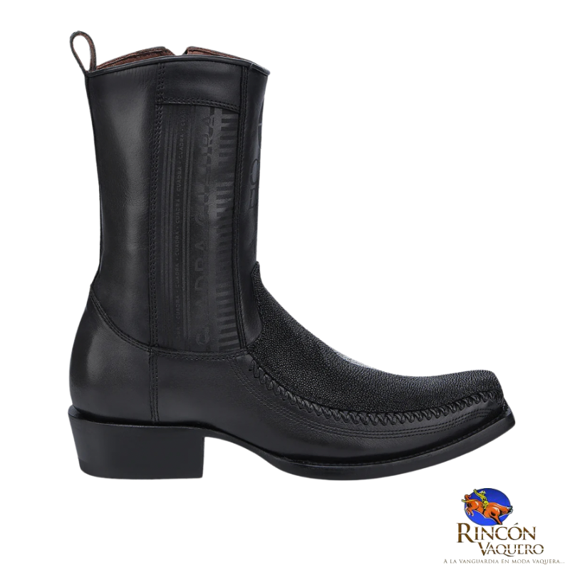 Bota para caballero en piel genuina de mantarraya y piel de bovino. El tubo cuenta con detalles grabados como el logotipo Cuadra. Presenta aplicación de piel de mantarraya en un margen de tejido de piel a tipo artesanal. Suela de cuero con TPU. Ajuste mediante cierre interno.