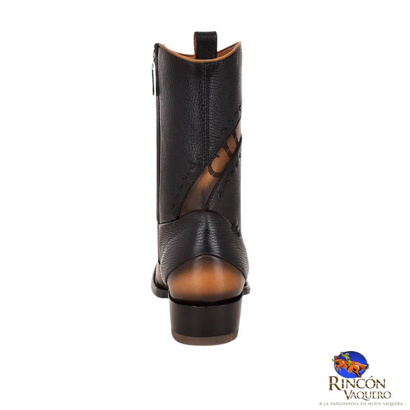 Bota para caballero en piel genuina de bovino. Con detalles de tejido artesanal y grabado láser de logo Cuadra en tonos contrastantes .Las marcas y cicatrices que puede presentar lejos de ser considerados como defecto demuestran la autenticidad de cada producto.
