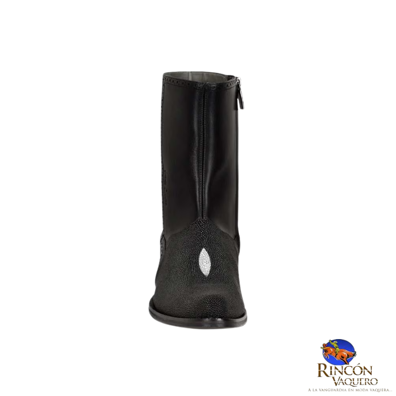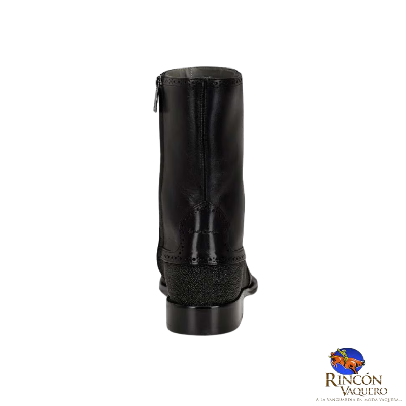 Bota para caballero en piel genuina de mantarraya y piel de bovino. Presenta sutiles detalles de brocado y grabado de logotipo Franco Cuadra. Ajustada con cierre interno. Con suela de cuero con injerto de TPU. Color negro. Las marcas y cicatrices que puede presentar, lejos de ser considerados como defecto, demuestran la autenticidad de cada producto. Cuidados: No doblar en exceso, ya que se puede dañar el acabado fino de la piel, no jalar o dañar grabado láser y no tallar placa / troquelado. Mantenimiento: Limpiar con un paño suave y ligeramente húmedo (con agua limpia) para eliminar la suciedad, después usar una esponja lustradora de piel.