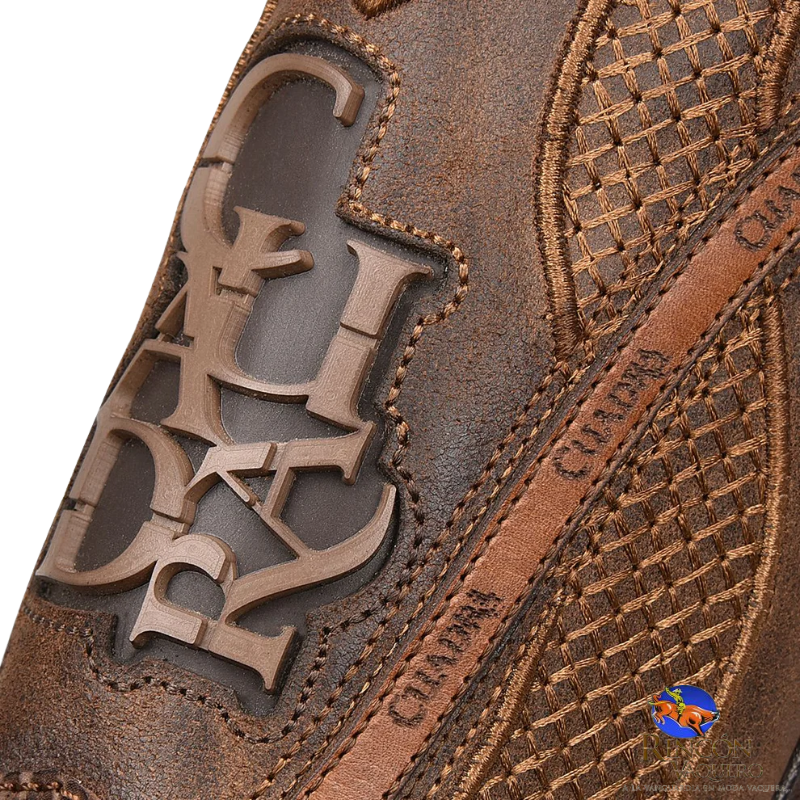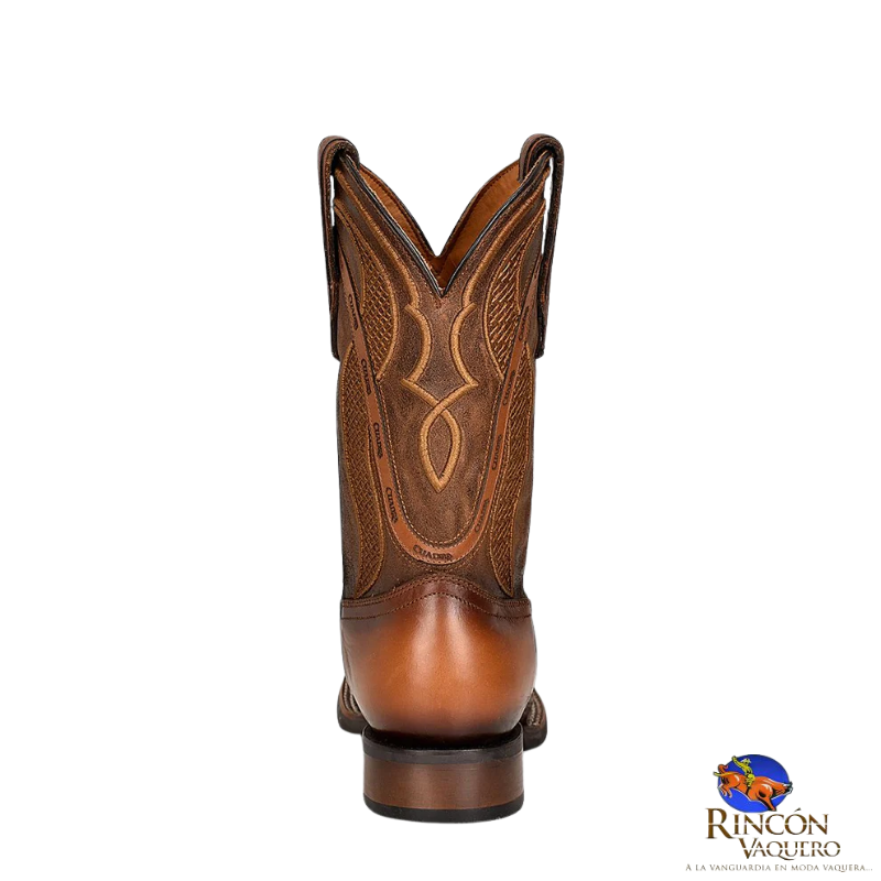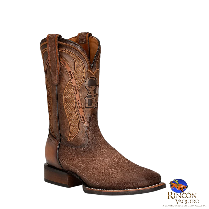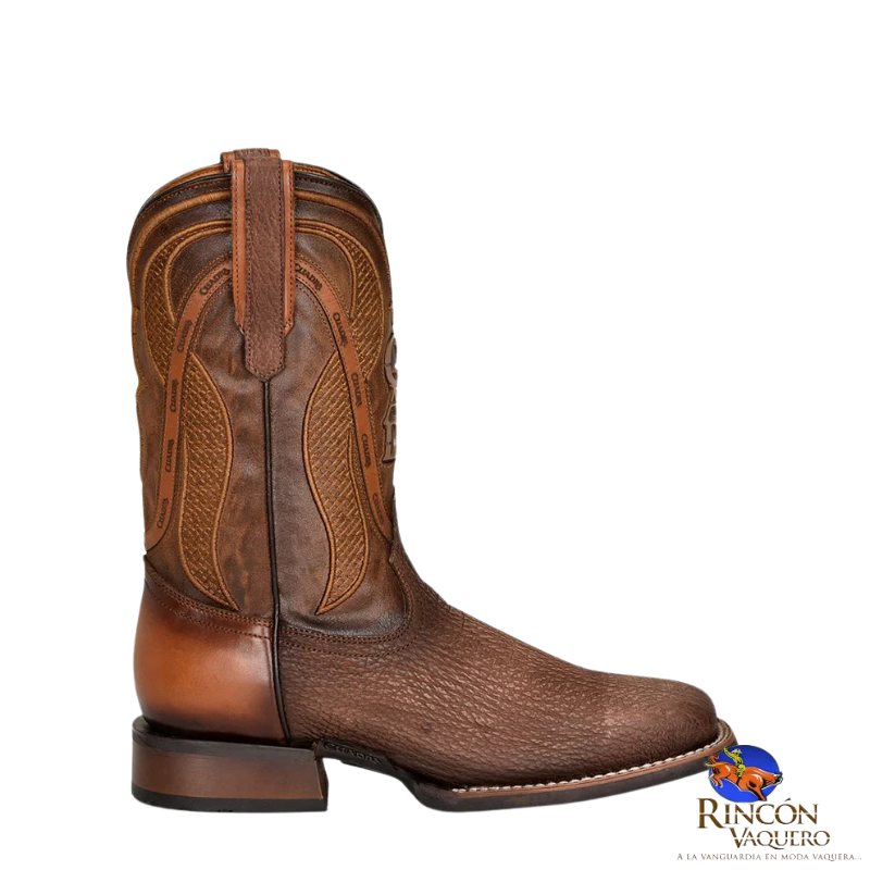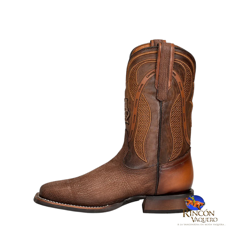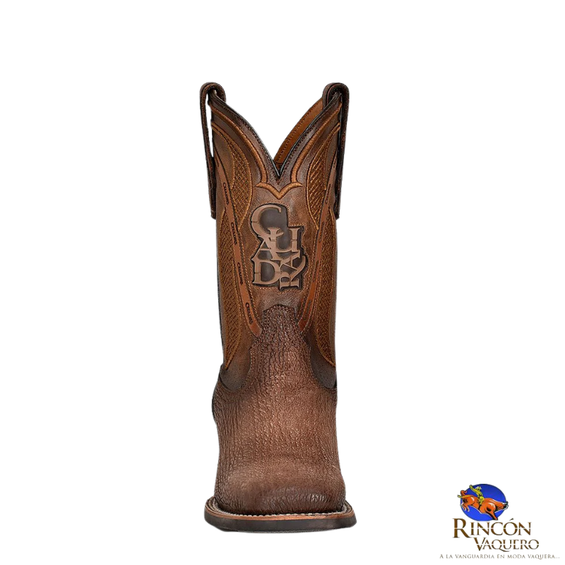 Bota para caballero en piel genuina de tiburón y piel de bovino. Sobre el tubo presenta aplicaciones de piel y perforaciones en colores ligeramente contrastantes. Con aplicación metálica de monograma Cuadra y detalles de fino bordado. Ajustada con cierre interno. Con suela de cuero con injerto de TPU antiderrapante.