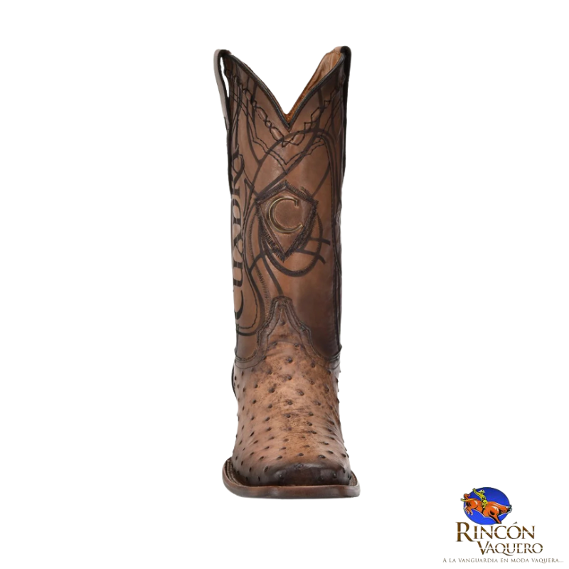 Bota rodeo para caballero en piel genuina de avestruz y piel de bovino. Presenta grabado láser en motivos orgánicos y de logotipo Cuadra sobre el tubo, aplicación metálica de monograma Cuadra al frente y detalles de bordado. Con orejas en los costados con aplicaciones en piel de avestruz. Suela de cuero con nuevo injerto antiderrapante de TPU.