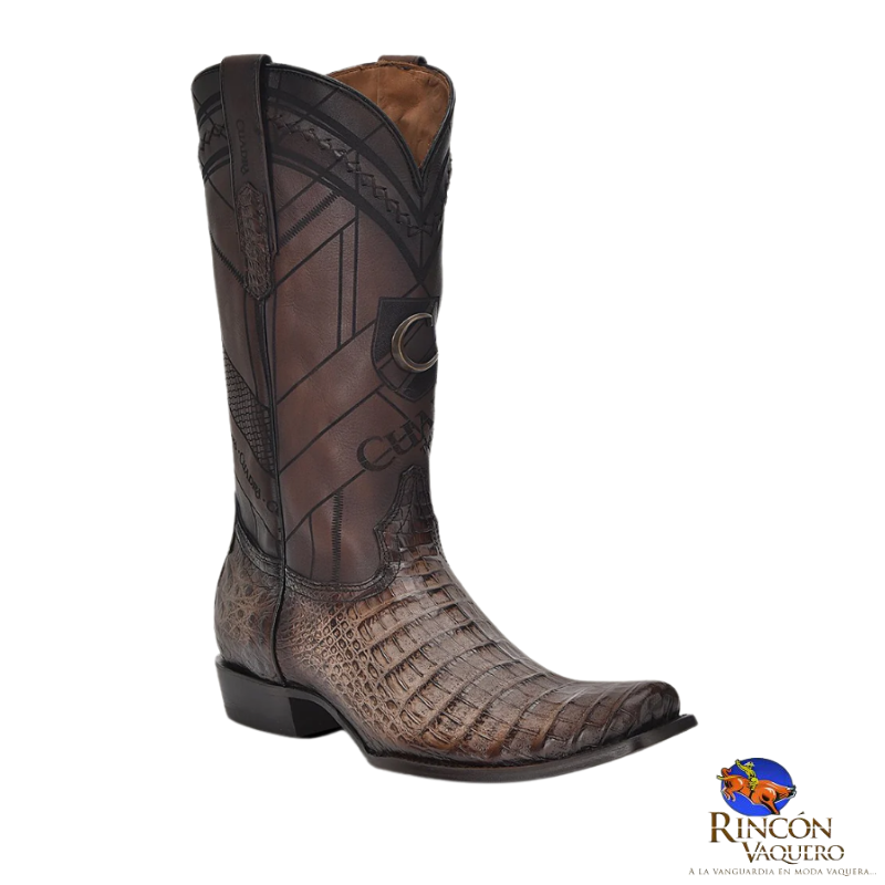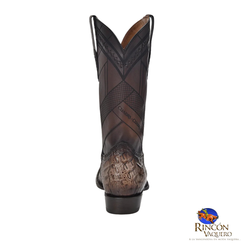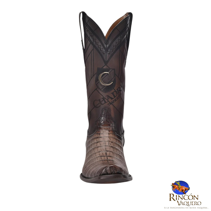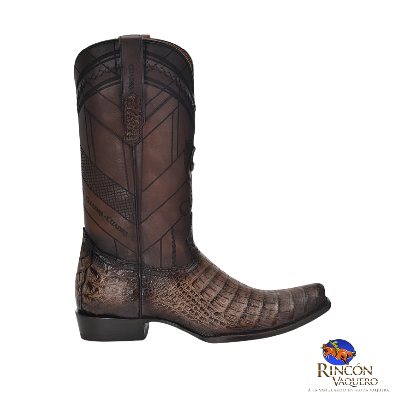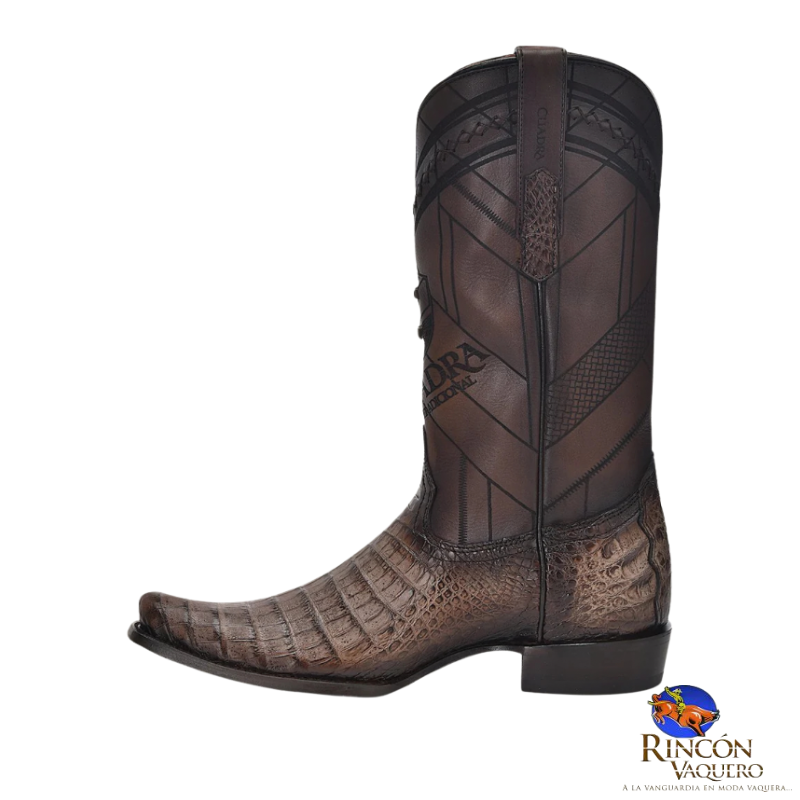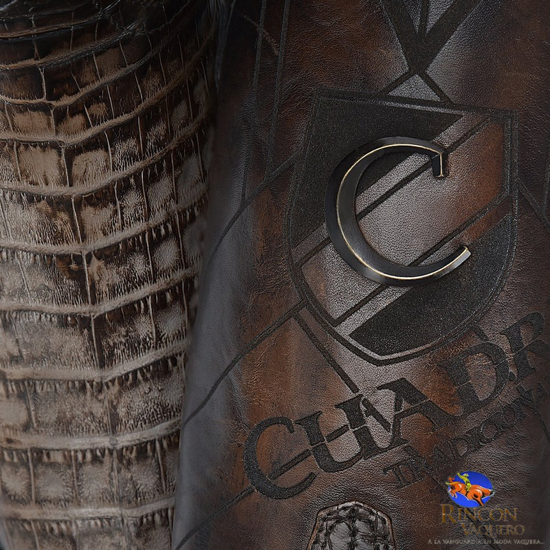 Bota vaquera para caballero en piel genuina de caimán fuscus y piel de bovino. Presenta grabado láser en motivos geométricos sobre el tubo, aplicación metálica de monograma Cuadra al frente, detalles de bordado y grabado de logotipo Cuadra. Con orejas en los costados con aplicaciones en piel de fuscus. Suela de cuero con injerto de TPU.