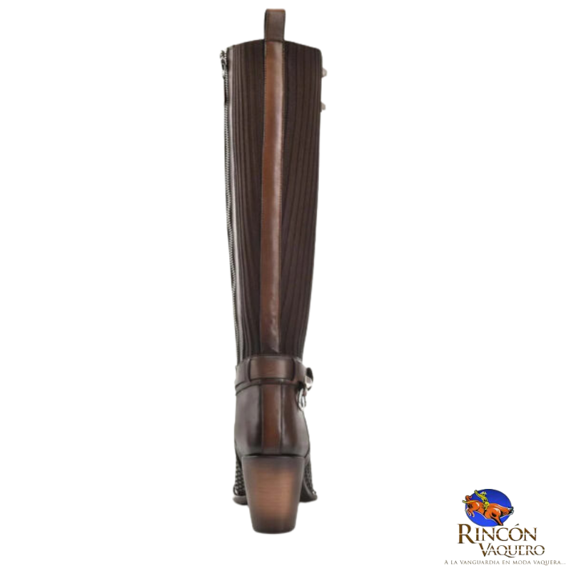 Bota alta para dama en piel de bovino. Presenta sutiles detalles de perforación láser, estoperoles metálicos y correa decorativa. Con aplicación textil elástica en el tubo para mejor ajuste y cierre interno. Suela de cuero con injerto antiderrapante de TPU y cómoda plantilla flex removible.