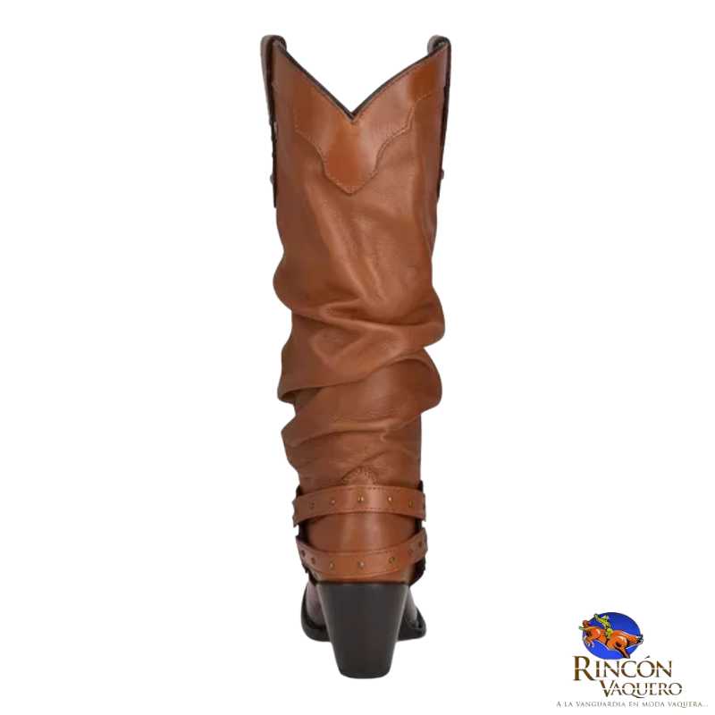 Un modelo femenino con una silueta inspirada en el clásico estilo Western. Perfecta para que luzcas tus vestidos favoritos., Bota larga par dama de piel genuina de bovino, diseño con detalles perforados en tobillo y jaladeras que forman patrones muy femeninos.