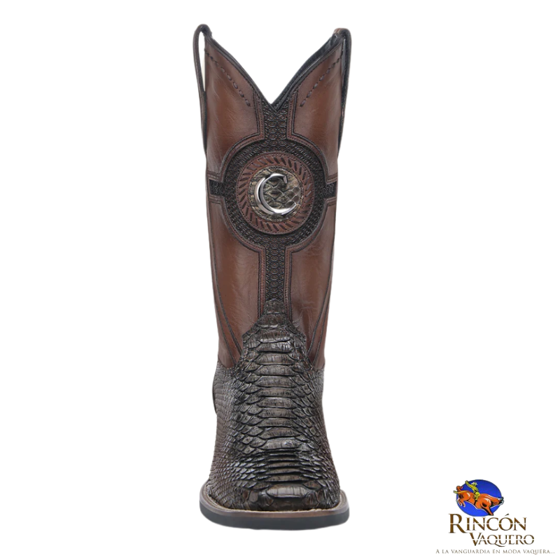 Bota rodeo para caballero en piel genuina de pitón. El tubo presenta grabado láser de logotipo Cuadra y detalles de bordado. Orejas con aplicaciones de piel genuina. Suela de cuero con injerto de TPU.