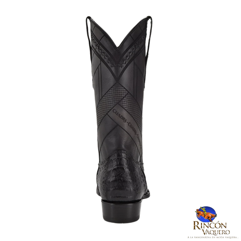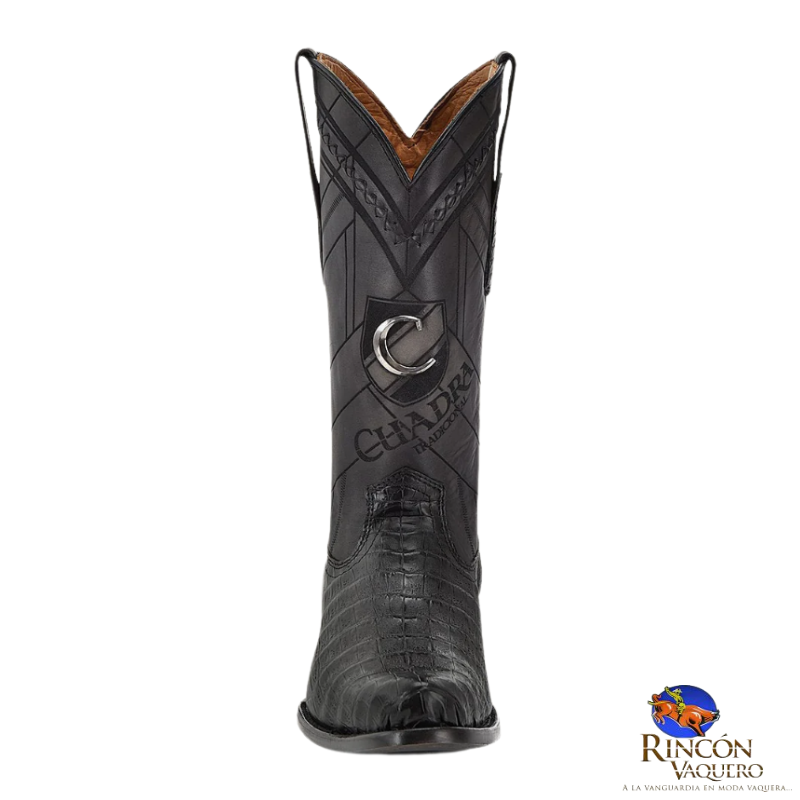 Bota vaquera para caballero en piel genuina de caimán fuscus y piel de bovino. Presenta grabado láser en motivos geométricos sobre el tubo, aplicación metálica de monograma Cuadra al frente, detalles de bordado y grabado de logotipo Cuadra. Con orejas en los costados con aplicaciones en piel de fuscus. Suela de cuero con injerto de TPU.