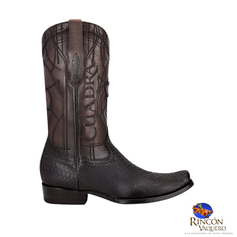 Bota tradicional para caballero en piel genuina de bovino. Diseño con detalles grabados en tubo, una combinación de líneas orgánicas en conjunto con el exclusivo logotipo Cuadra. Modelo pintado a mano.