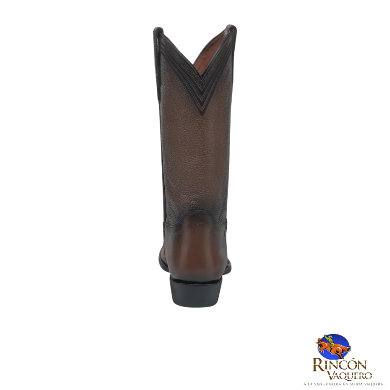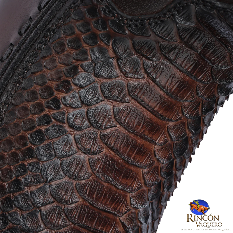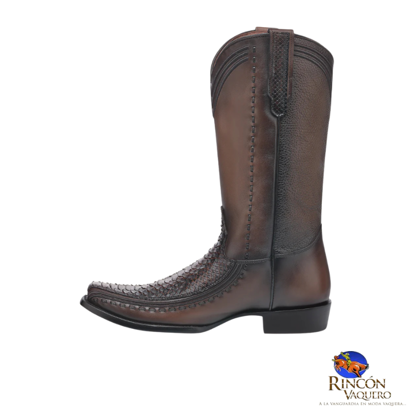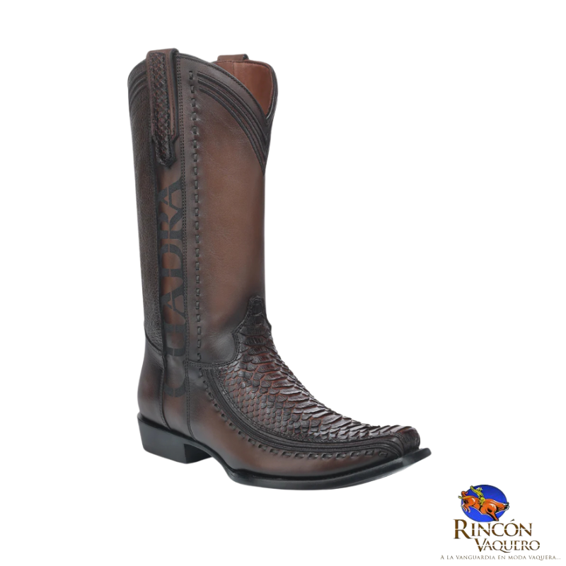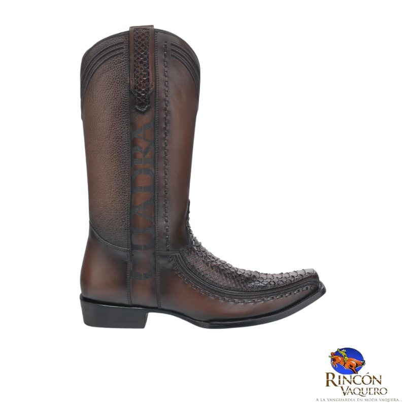 Bota vaquera para caballero en piel genuina de pitón y piel de bovino. Presenta grabado del logotipo Cuadra al costado, tejido de piel y bordado en alto relieve. Las orejas presentan aplicación de piel genuina de pitón. Suela de cuero con injerto de TPU. Color miel.