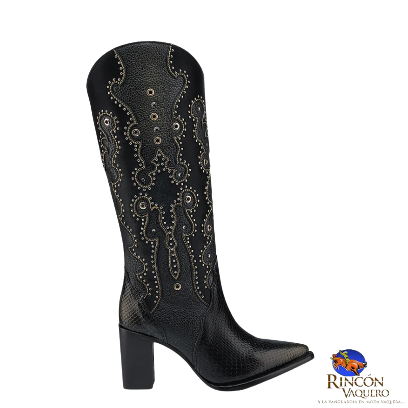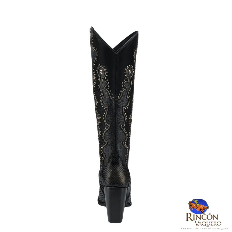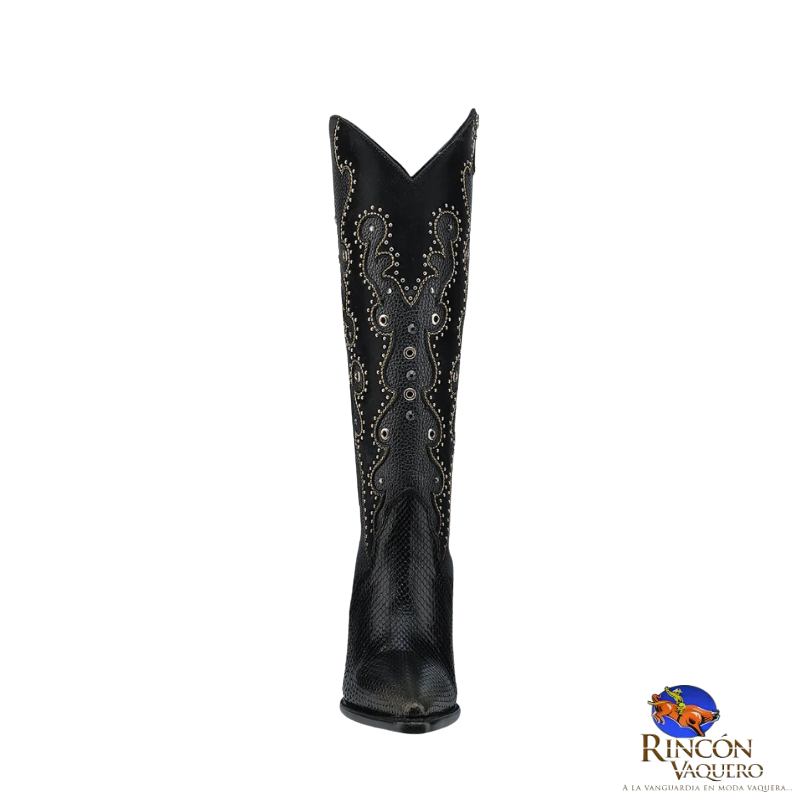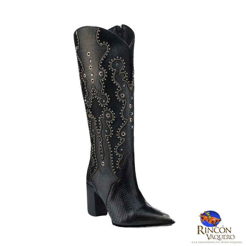 Bota western para dama en piel genuina de pitón y piel de bovino. Presenta ojillos, estoperoles y cristales auténticos. Con aplicaciones de piel en textura y color contrastante y acabado tornasol dorado pintado a mano. Ajustada con cierre interno. Suela con injerto de TPU.