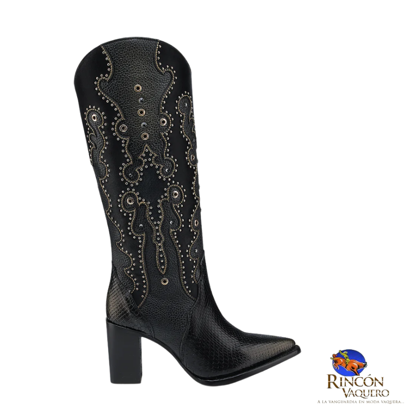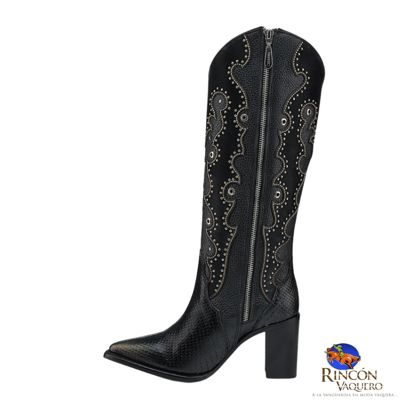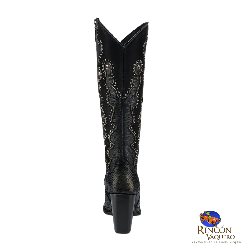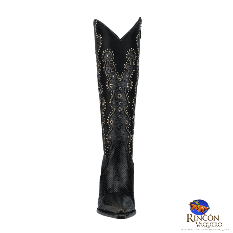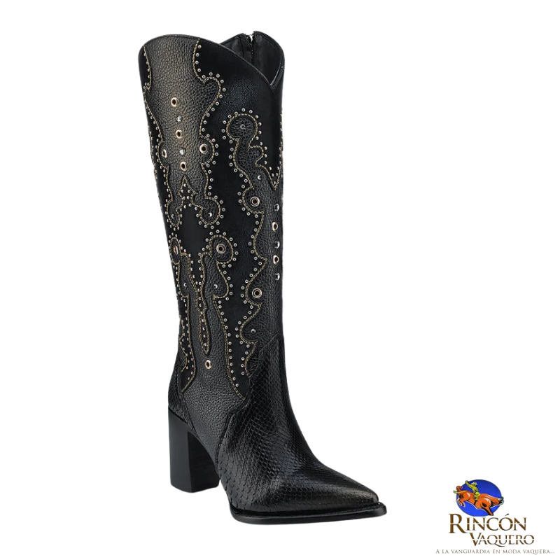 Bota western para dama en piel genuina de pitón y piel de bovino. Presenta ojillos, estoperoles y cristales auténticos. Con aplicaciones de piel en textura y color contrastante y acabado tornasol dorado pintado a mano. Ajustada con cierre interno. Suela con injerto de TPU.