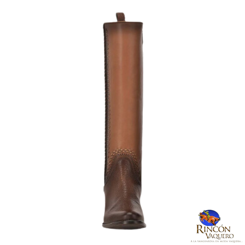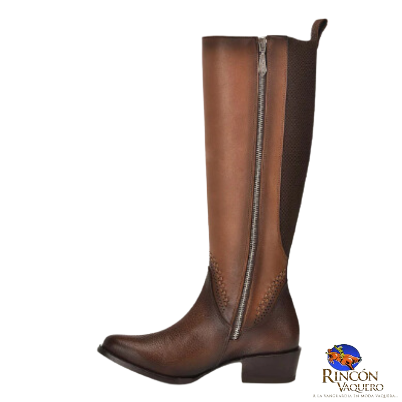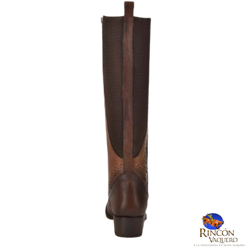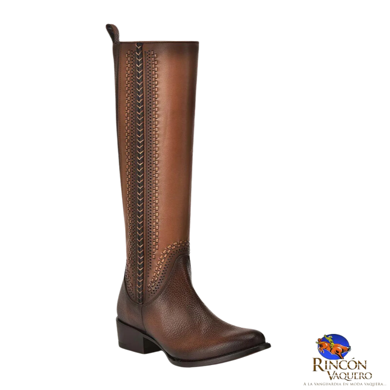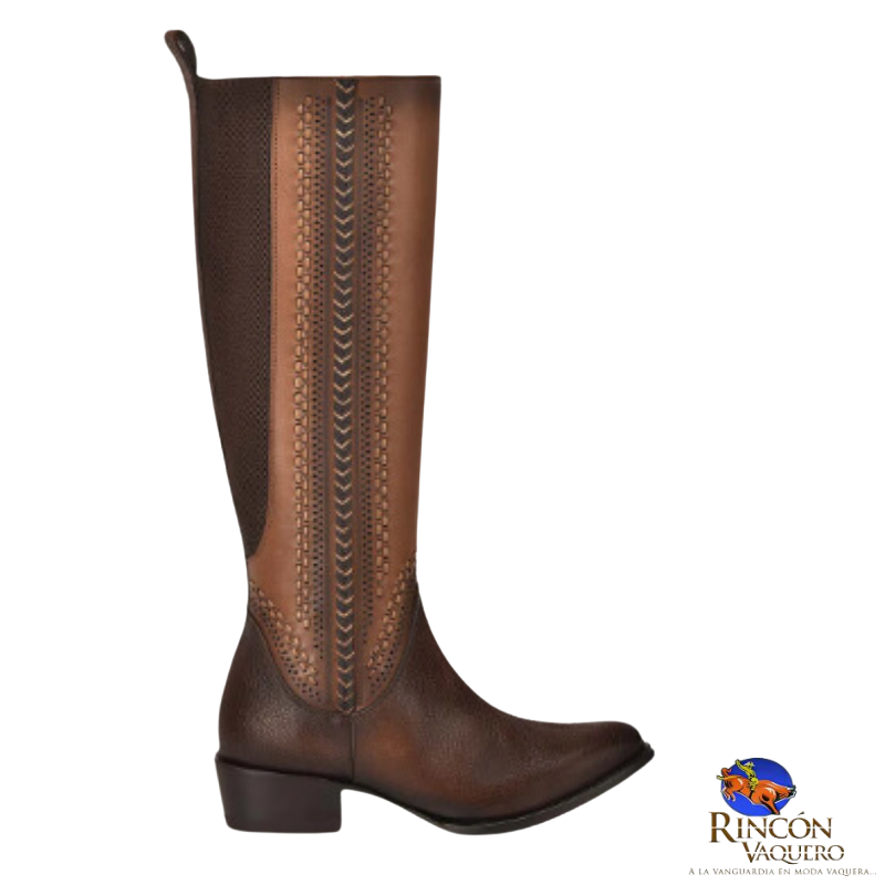 Bota alta para dama en piel de bovino. Con diferentes texturas sobre la piel de bovino. En el tubo presenta detalles de tejido artesanal, grabado láser y perforado. Ajustada con cierre interno y aplicaciones elásticas de textil para mejor ajuste. Con suela de cuero con injerto antiderrapante de TPU.