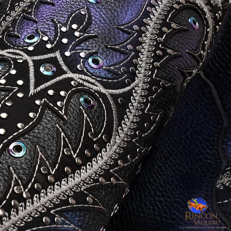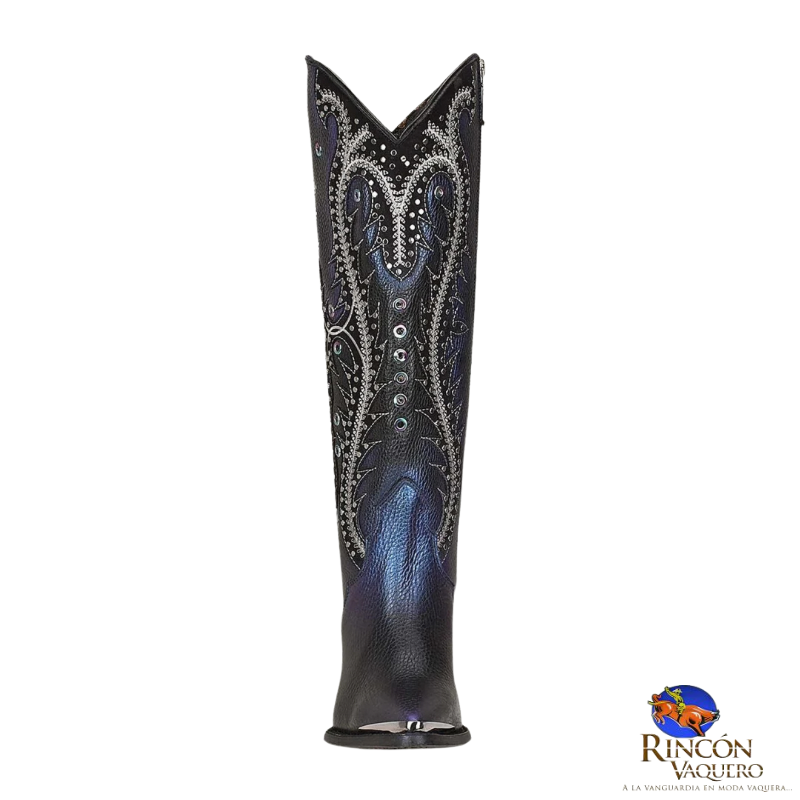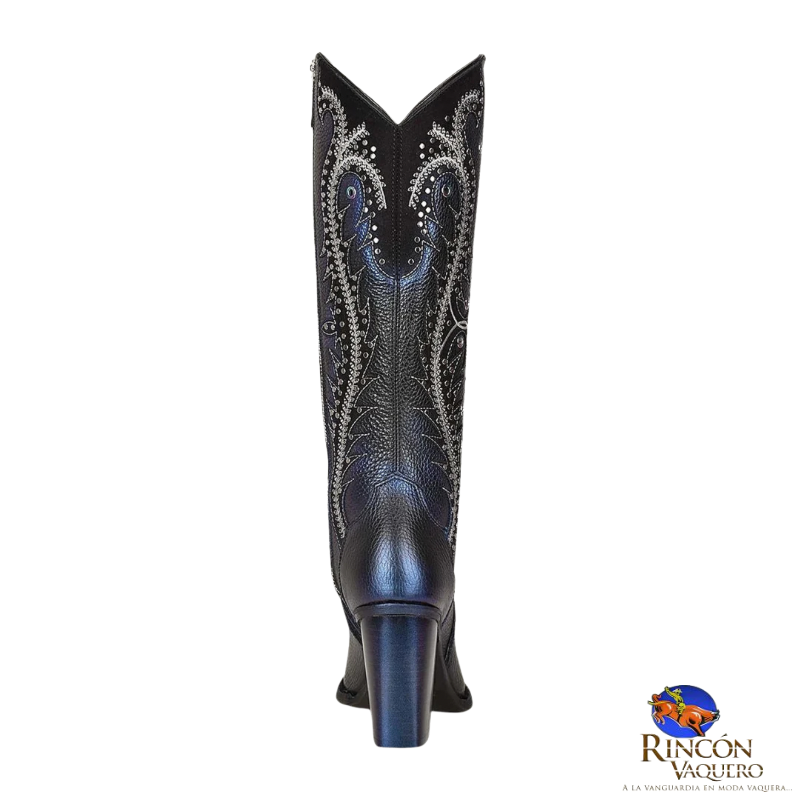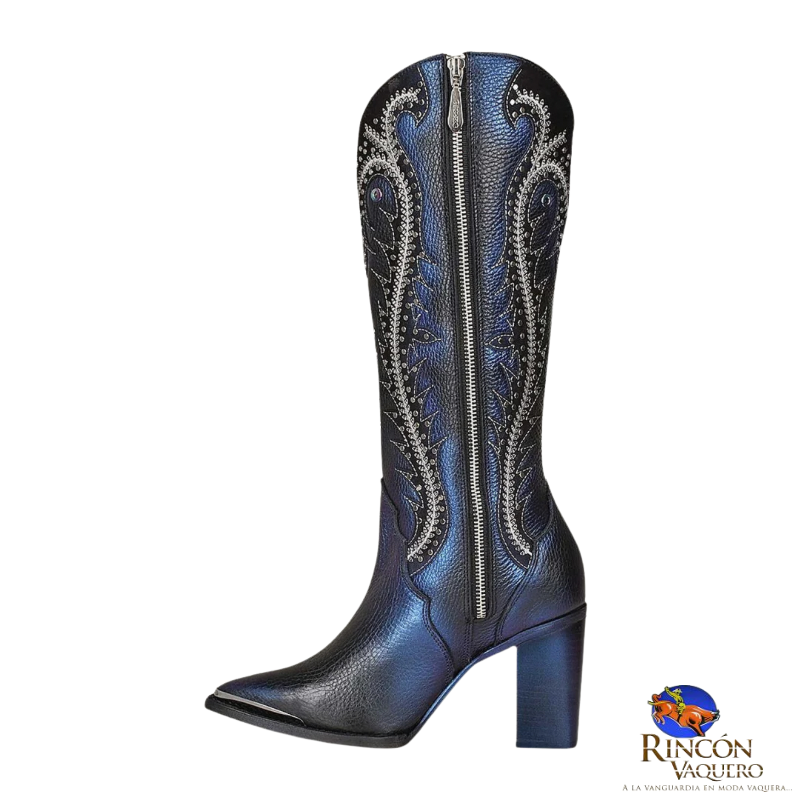 Bota alta para dama en piel de bovino. Presenta ojillos, estoperoles y puntera metálica. Con aplicaciones de piel en textura y color contrastante y acabado pintado a mano. Ajustada con cierre interno. Con suela de cuero con injerto antiderrapante de TPU.