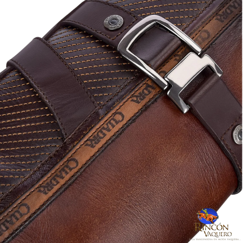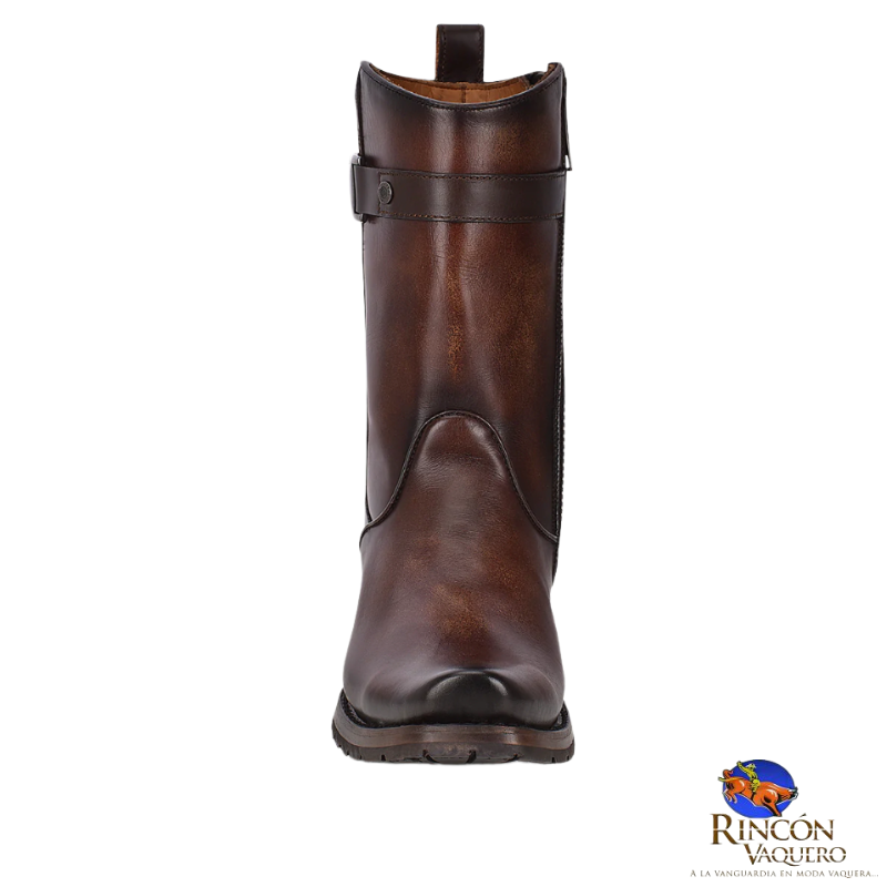 Bota para caballero en piel de bovino. Presenta correa de piel alrededor del tubo con remaches, sujeta con aplicación metálica. Con grabado láser de logotipo Cuadra en un costado y bordado sobre el tubo. Ajustada con cierre interno. Con suela de cuero y hule.