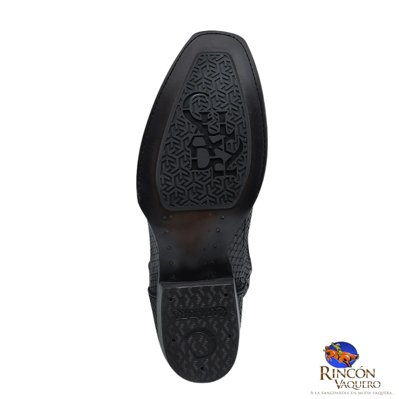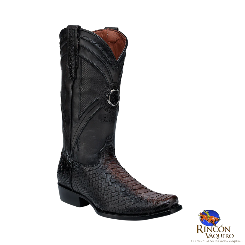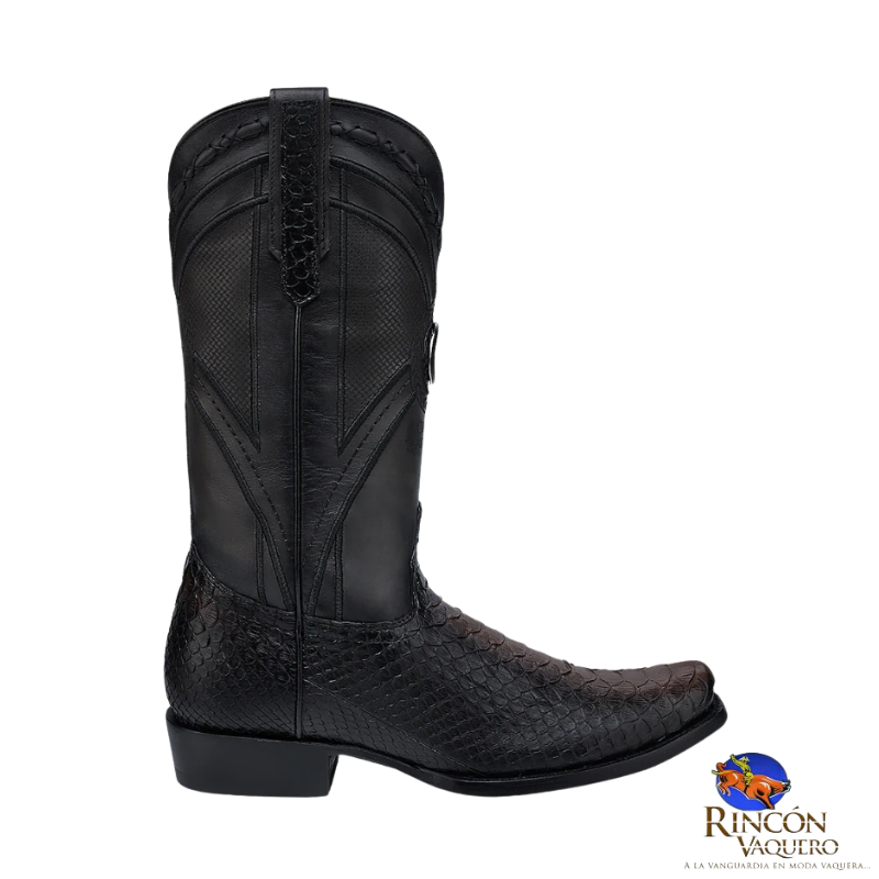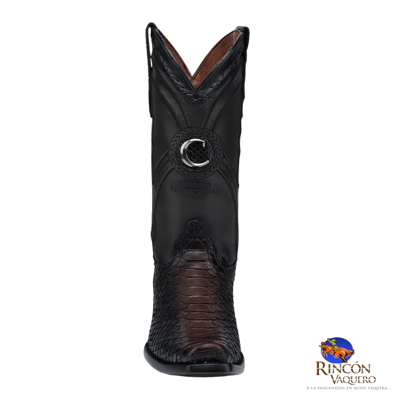 Bota vaquera para caballero en piel genuina de pitón y piel de bovino. El tubo cuenta con aplicación metálica del monograma Cuadra en la parte frontal, así como grabado en piel de la marca. Presenta detalles de bordado en alto relieve y contraste de texturas en la parte lateral del tubo. Las orejas cuentan con aplicación de piel genuina de pitón. Suela de cuero con injerto de TPU. Color negro.