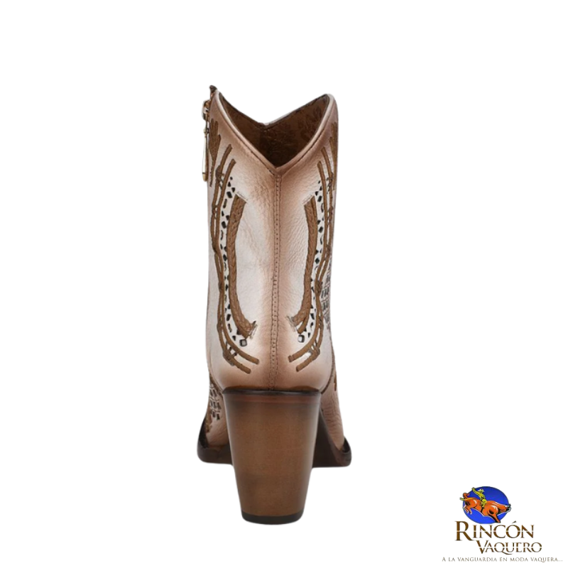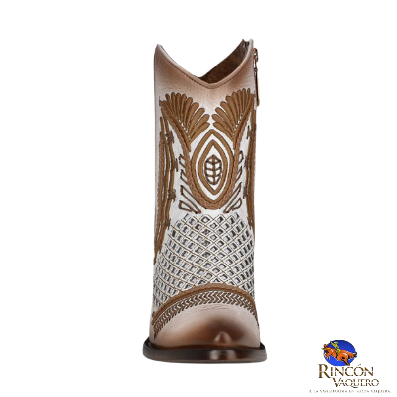 Botín para dama en piel de bovino. Presenta perforado en motivos geométricos, bordado, tejido artesanal y tira de piel trenzada de manera artesanal al frente y en los costados. Con acabado sombreado y suela de cuero con injerto de TPU. Ajustado con cierre interno.