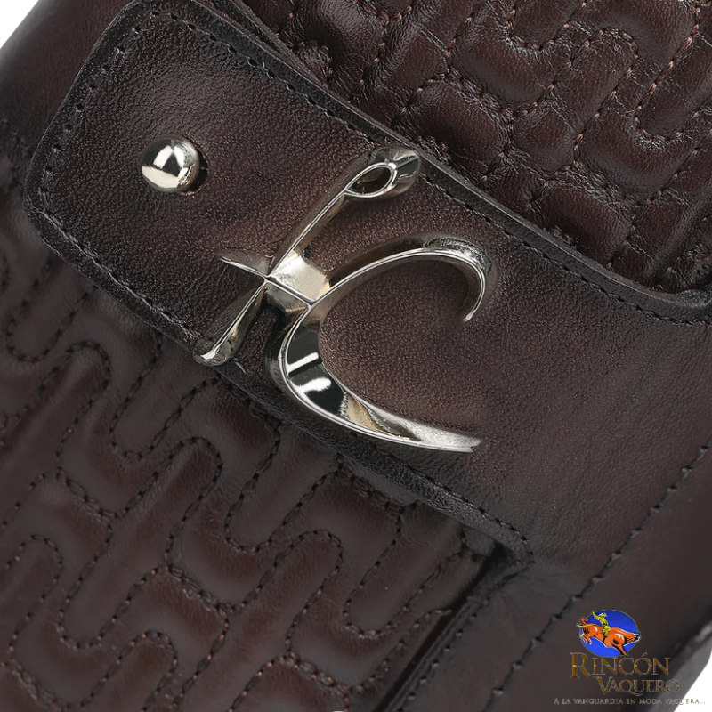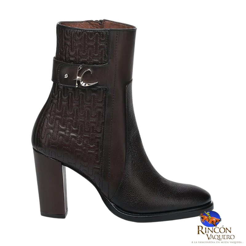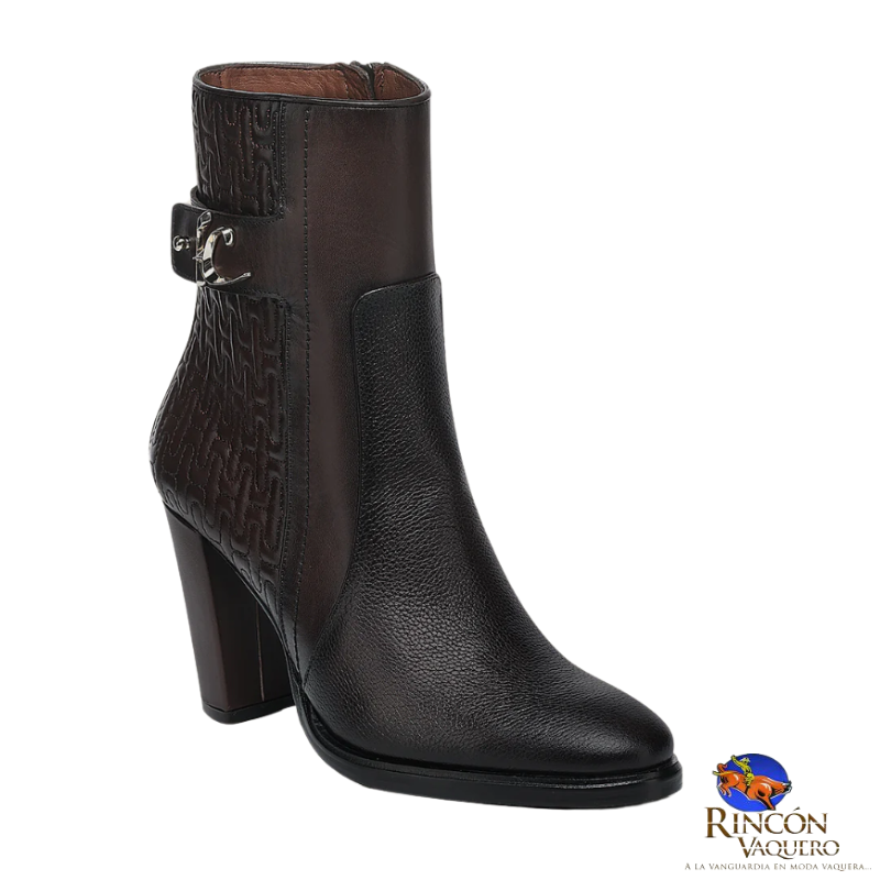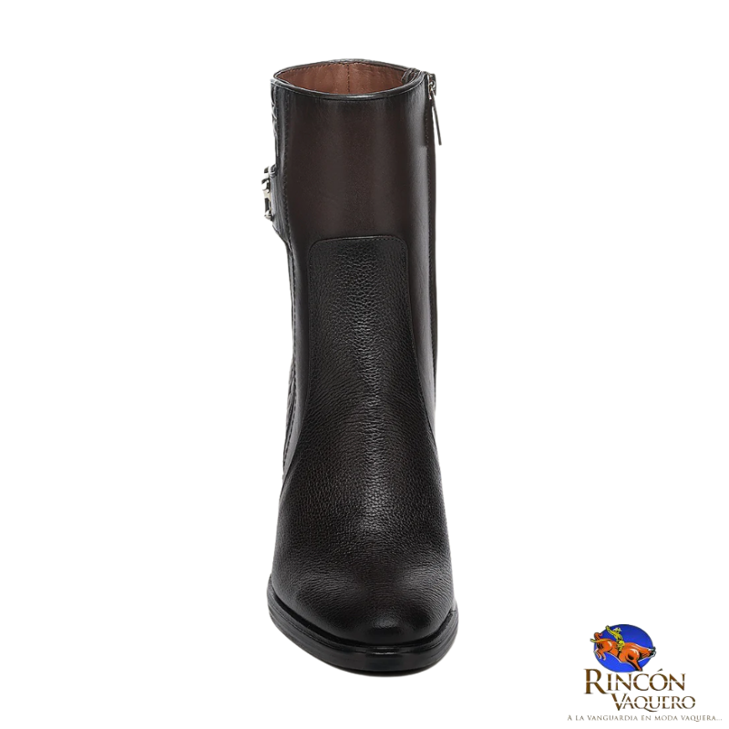 Botín de vestir para dama en piel genuina de ternera. Presenta capitonado en la parte trasera y una correa decorativa alrededor del tobillo sujeta con herraje del monograma FC. Ajustado con cierre interno. Suela de cuero con injerto de TPU.