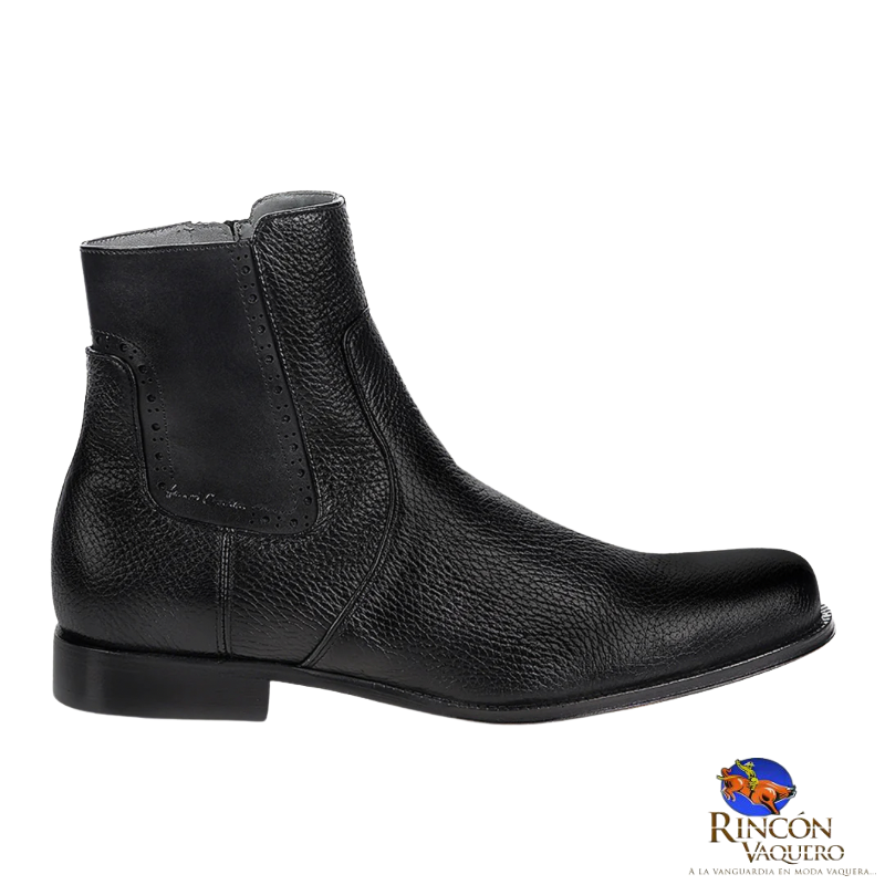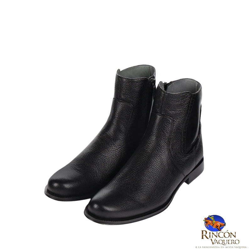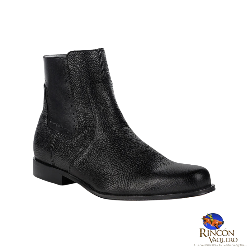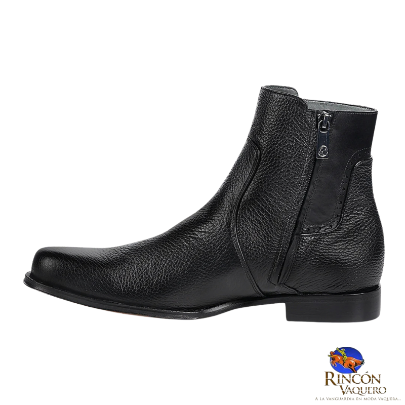 Botín para caballero en piel genuina de venado y piel de bovino. Presenta contraste de texturas y detalles de sombreado en piel, así como troquelado a modo decorativo y grabado del logotipo Franco Cuadra. Ajuste por medio de cierre interno. Suela de cuero con TPU.