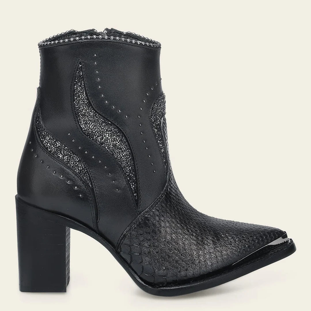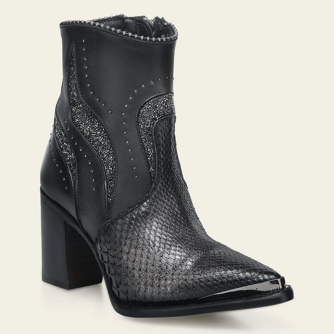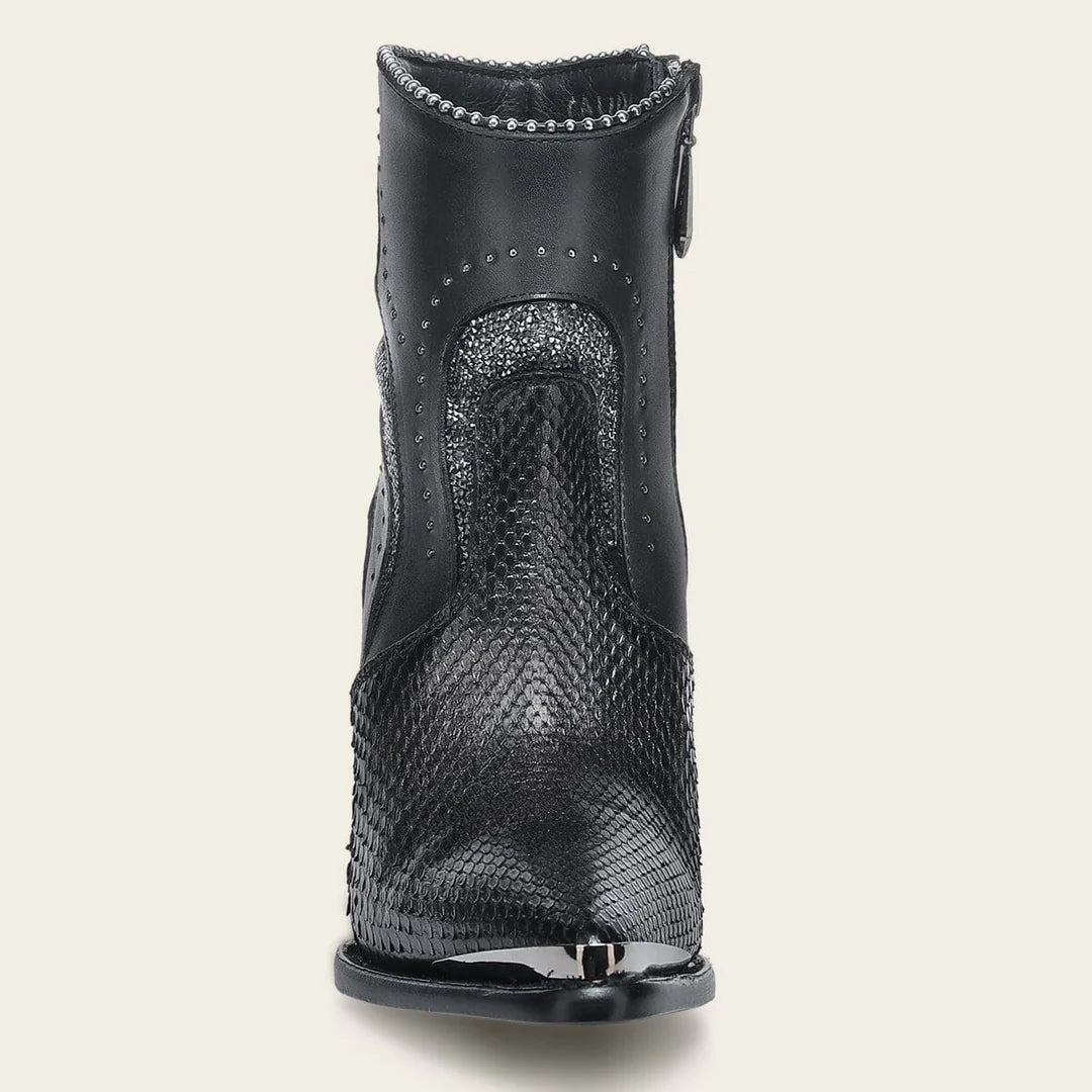 Botín para dama en piel genuina de pitón y piel de bovino. Presenta aplicación de fina pedrería, herrajes metálicos, cadena metálica y puntera metálica. Con acabado metálico. Ajustado con cierre interno. Cuenta con las nuevas tecnologías: planta Ortholite y plantilla flex removible. Con suela con injerto de TPU