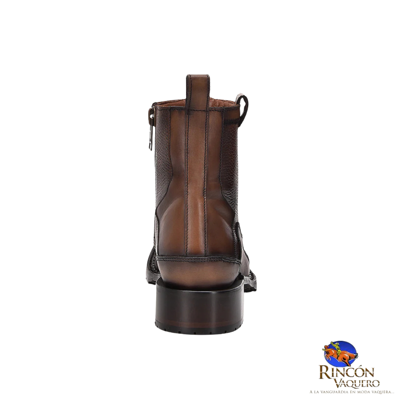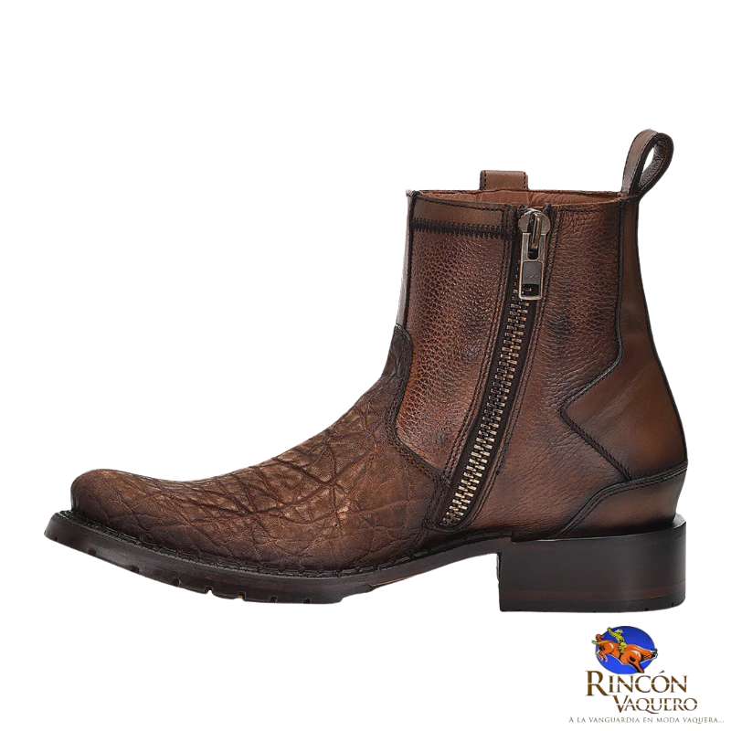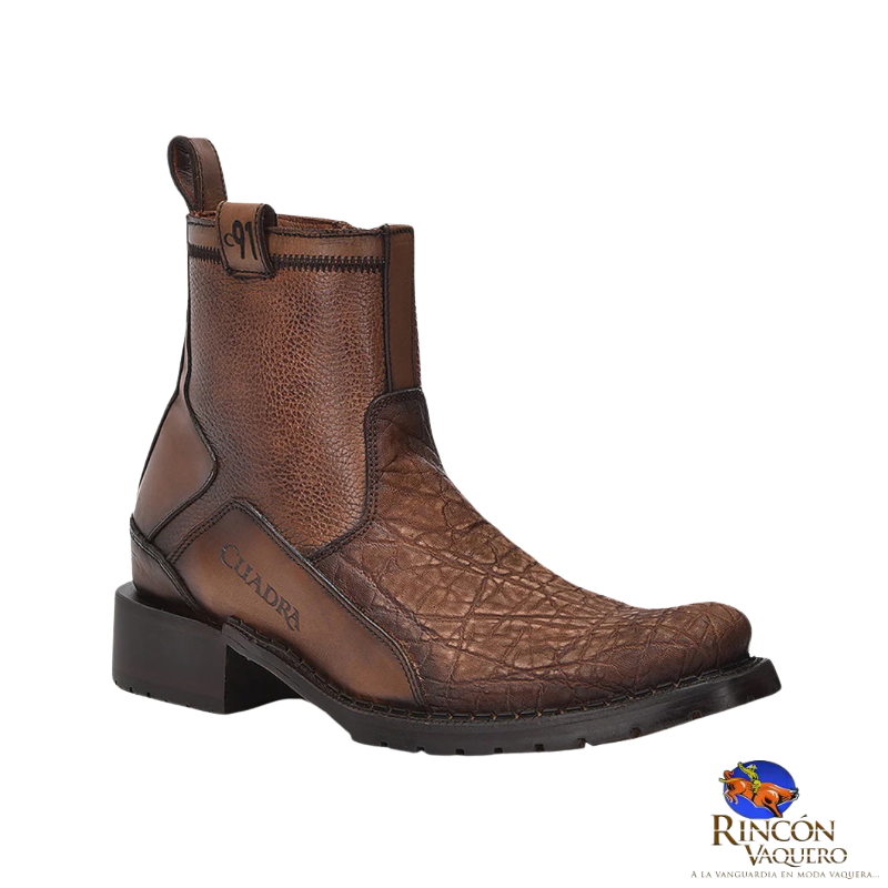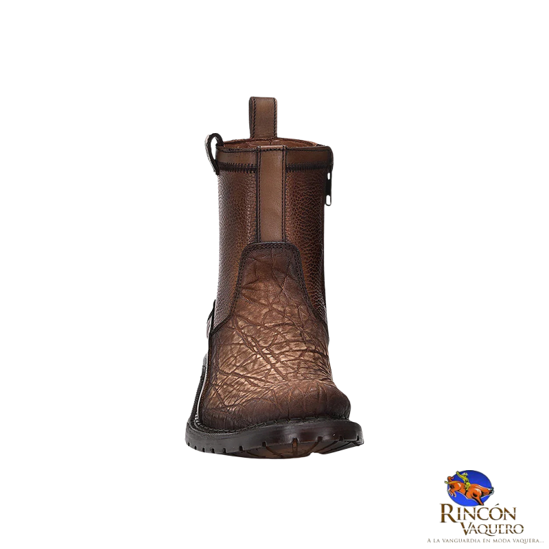Botín urbano para caballero en piel genuina de elefante y piel de bovino. En un costado presenta grabado láser de logotipo Cuadra y en la parte trasera grabado "Goodyear Welt". Ajustado con cierre interno. Suela de cuero con hule.