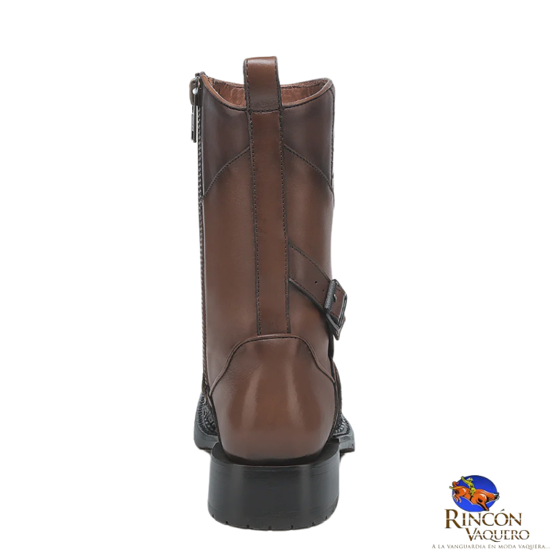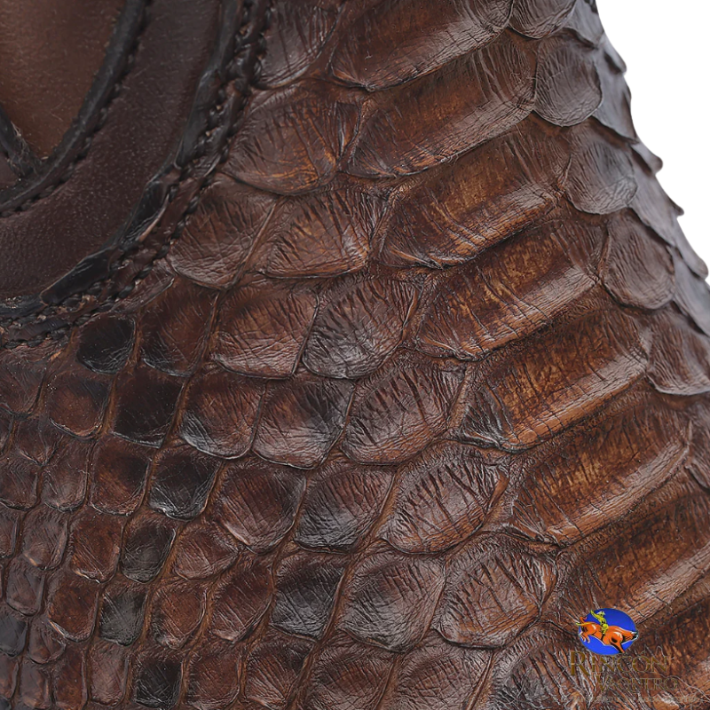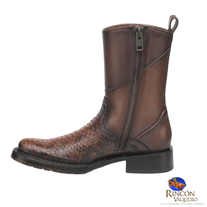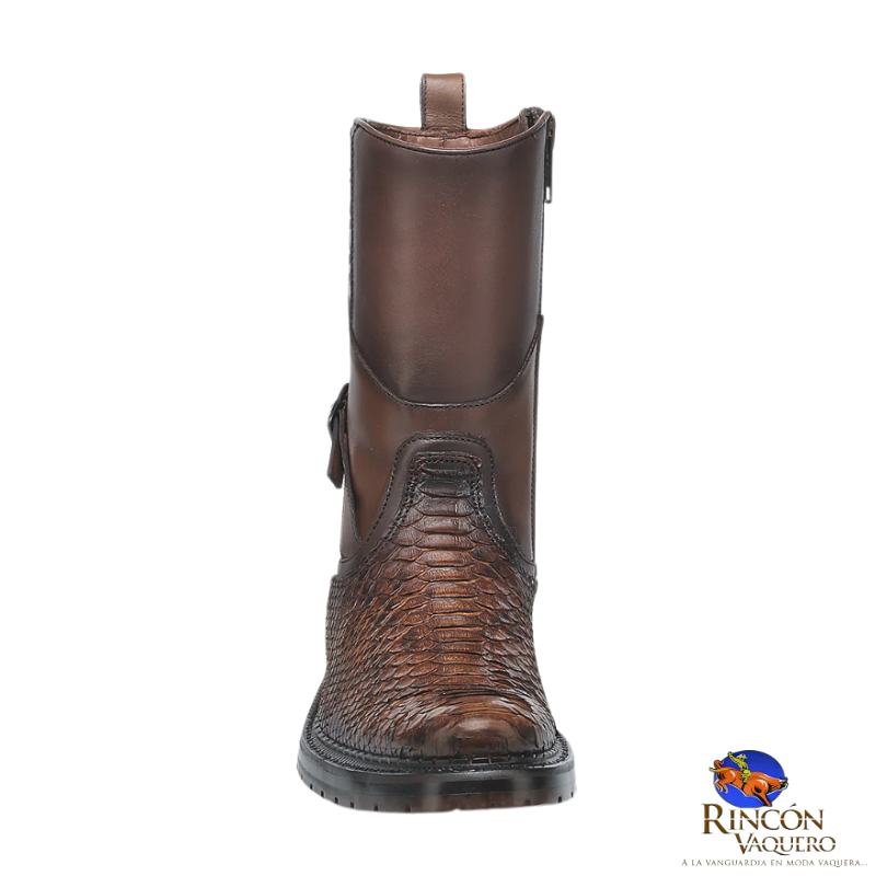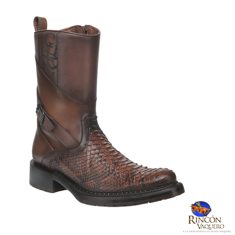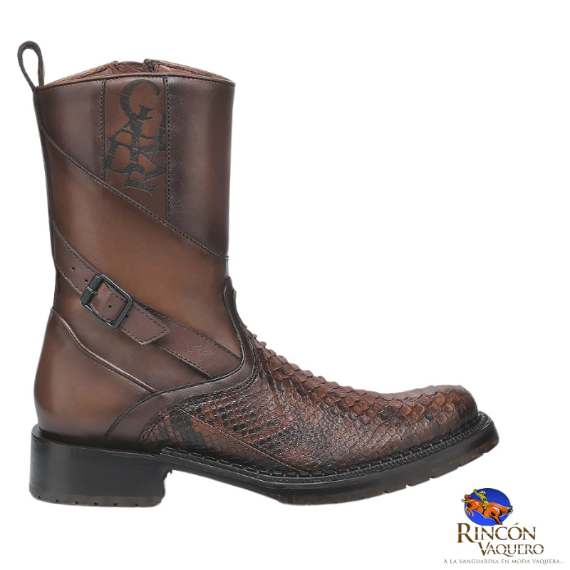 Bota para caballero en piel genuina de pitón y piel de bovino. Presenta grabado láser de logotipo Cuadra y correa decorativa en la parte trasera sujeta con aplicaciones metálicas. Ajustada con cierre interno Suela de cuero con injerto de TPU. Color miel.
