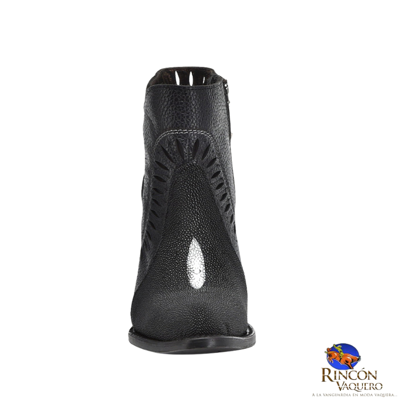 Botín para dama en piel genuina de mantarraya y piel de bovino. Cuenta con perforaciones alrededor del botín en motivos orgánicos, así como una pequeña aplicación metálica en talón. Ajuste con cierre interno. Suela con injerto de TPU.