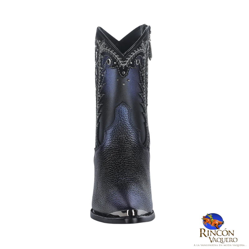 Botín tradicional para dama en piel de bovino. Presenta ojillos, estoperoles y puntera metálica. Con aplicaciones de piel en textura y color contrastante y acabado tornasol pintado a mano. Ajustada con cierre interno. Suela de cuero con TPU.
