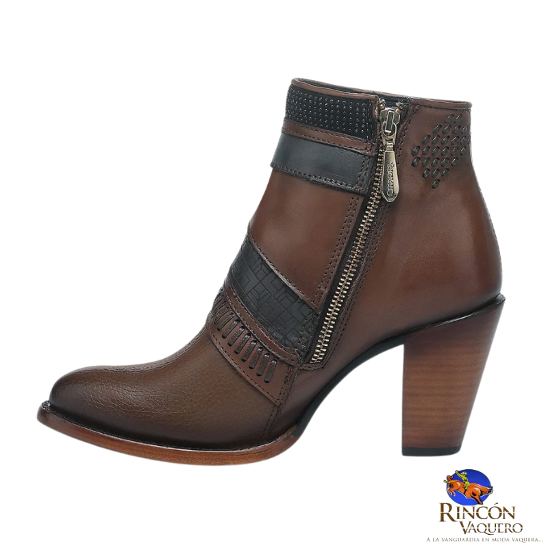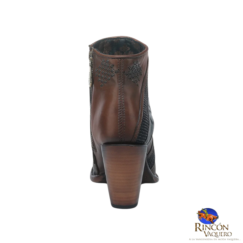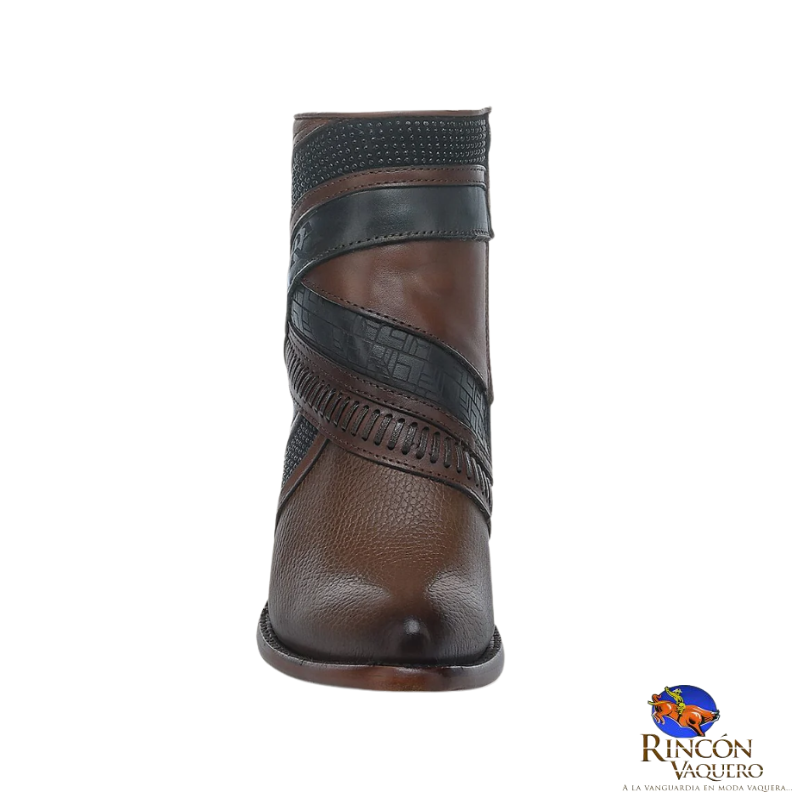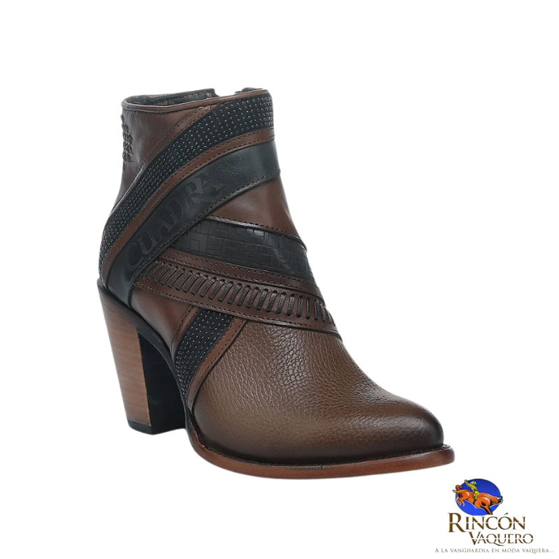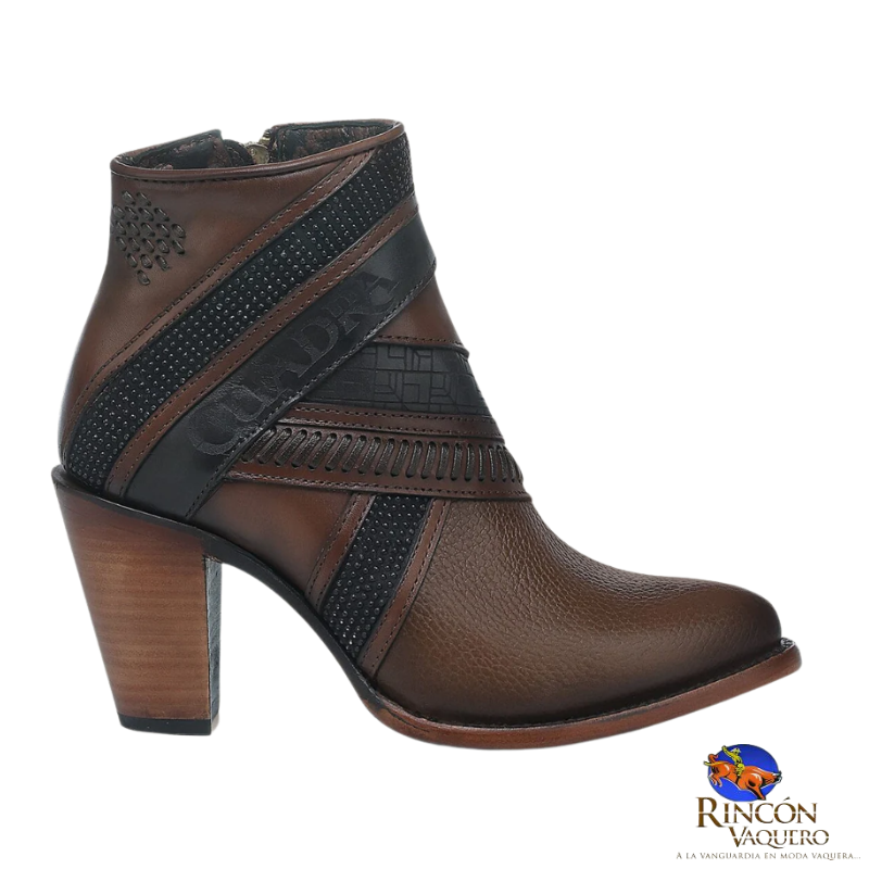 Botín para dama en piel genuina de bovino. Presenta detalles de tejido artesanal, grabado de logotipo Cuadra y motivos geométricos. Con aplicaciones metálicas y cierre interno. Suela de cuero con injerto de TPU.