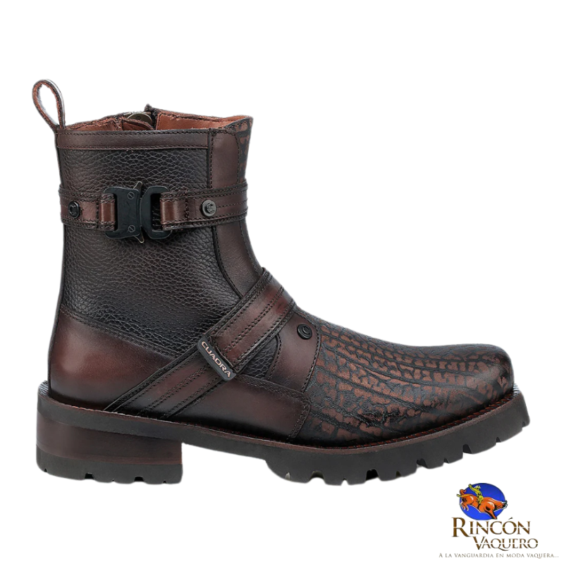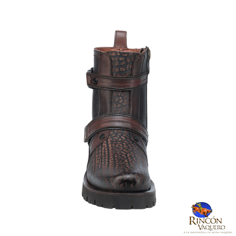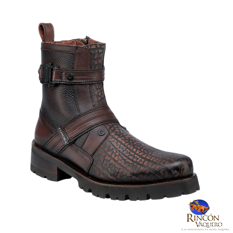 Botín urbano para caballero en piel genuina de toro y piel de bovino. Presenta dos correas decorativas alrededor, así como pequeñas aplicaciones del monograma Cuadra. Con suela XL EXTRALIGHT® compuesta de EVA, reconocida por su ligereza, resistencia al calor, flexibilidad y confort. Color miel.