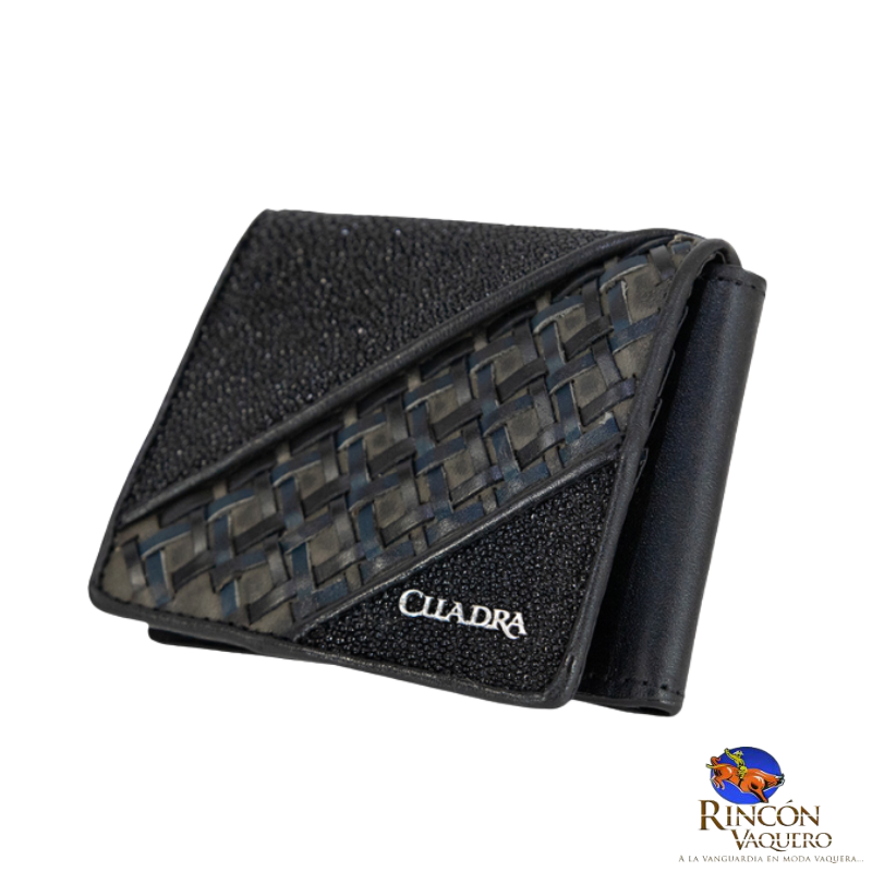 Billetera Cuadra B3022MA para caballero: piel genuina de mantarraya con monograma metálico; doble compartimento para billetes, 8 ranuras para tarjetas y monedero con cierre. Cada pieza es única.