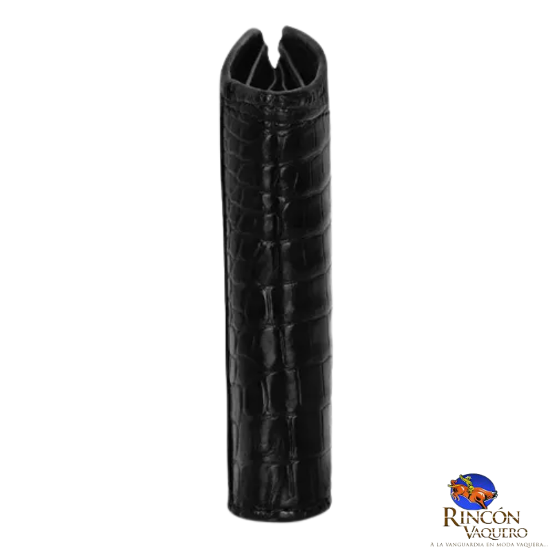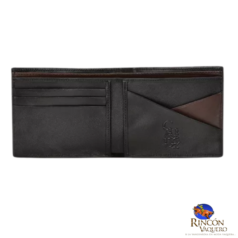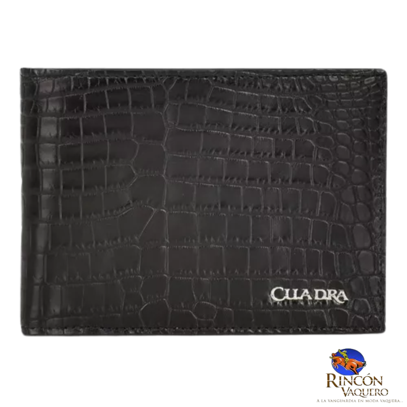Billetera Cuadra BC003NL: piel niloticus negra con textura exótica y diseño discreto; bifold artesanal con logo Cuadra, 4 ranuras para tarjetas y espacio para billetes.
