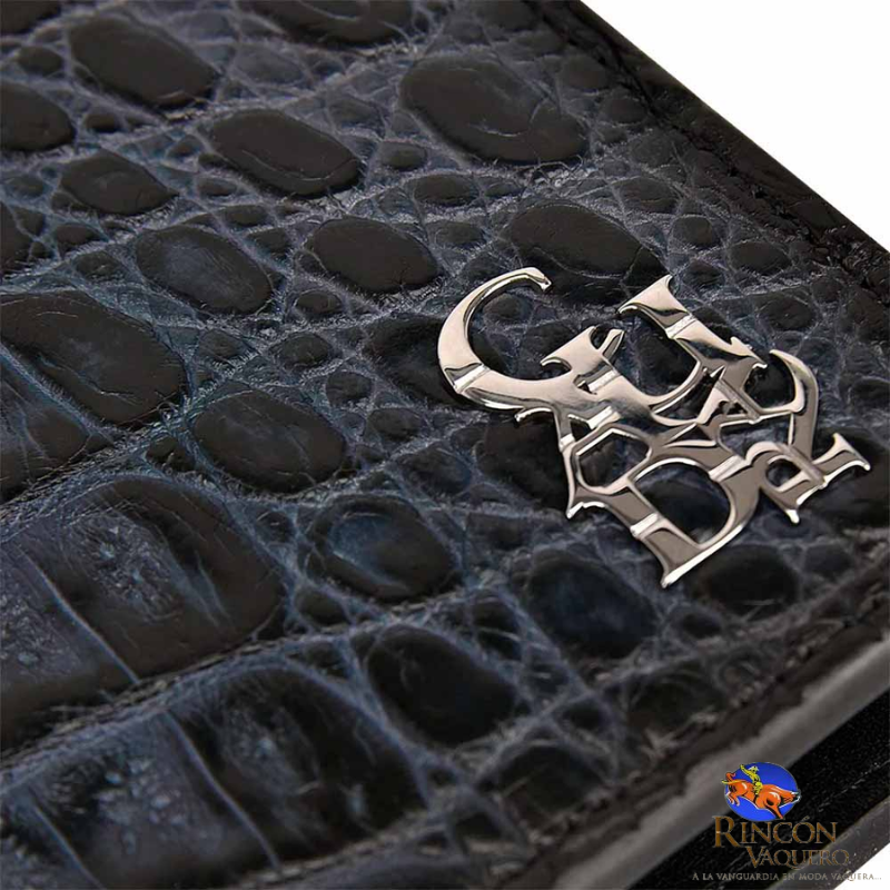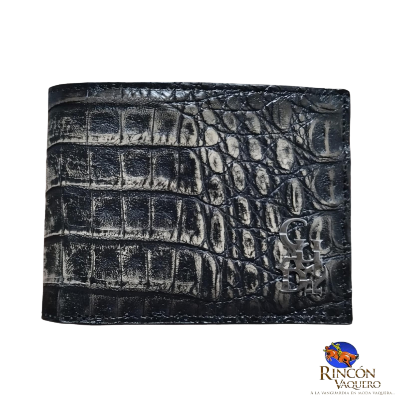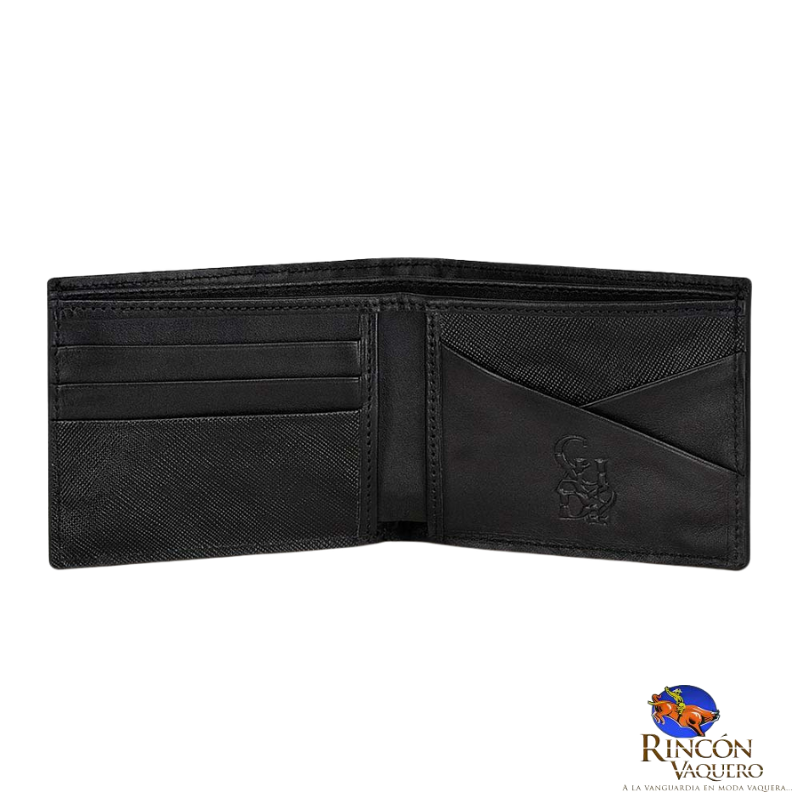 Billetera Cuadra BC019FL: piel genuina de fuscus color negro con monograma metálico; estilo vaquero; interior con 7 ranuras para tarjetas y 2 compartimentos para billetes.