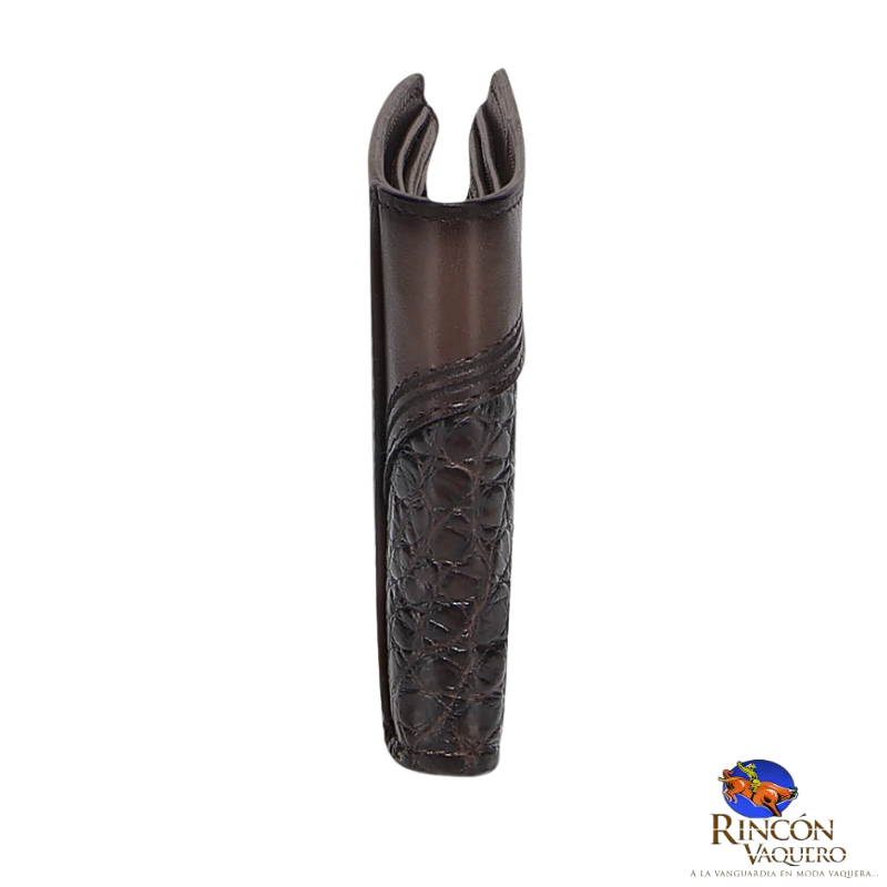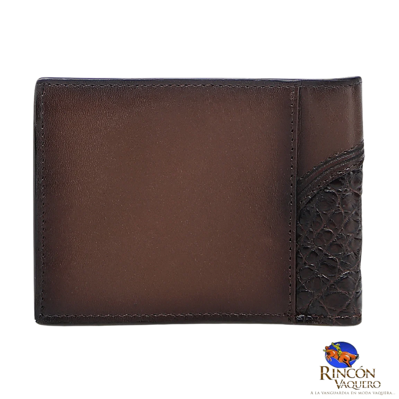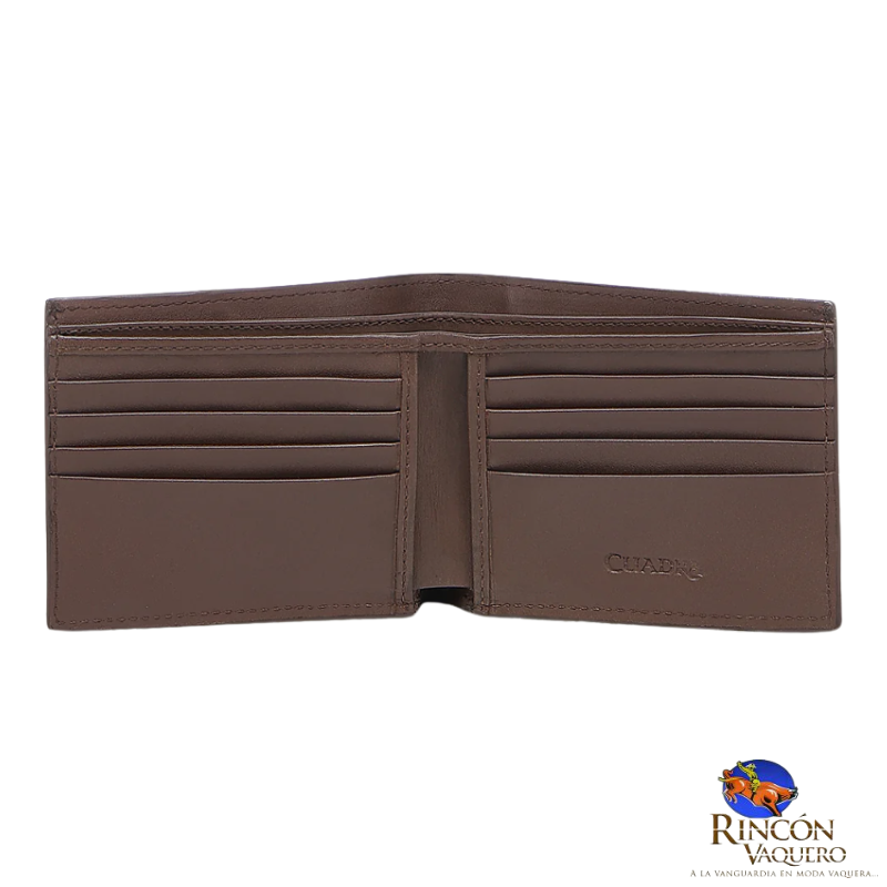 Cartera en piel genuina de alligator y piel de bovino para caballero. Al frente presenta tejido artesanal, grabado láser en motivos orgánicos y aplicación metálica del logotipo Cuadra. En su interior cuenta con ocho espacios para tarjetas y un espacio para efectivo.