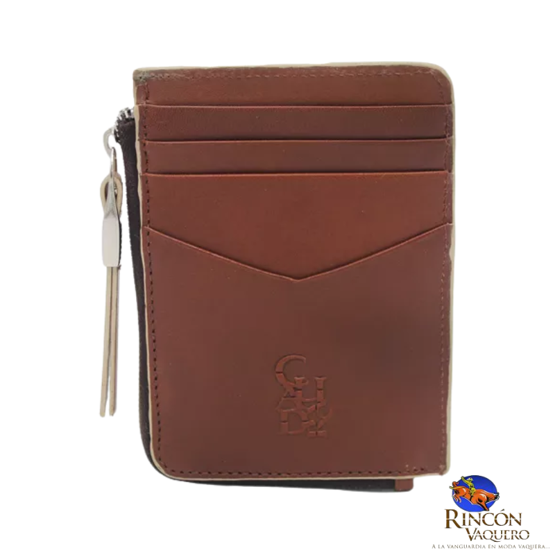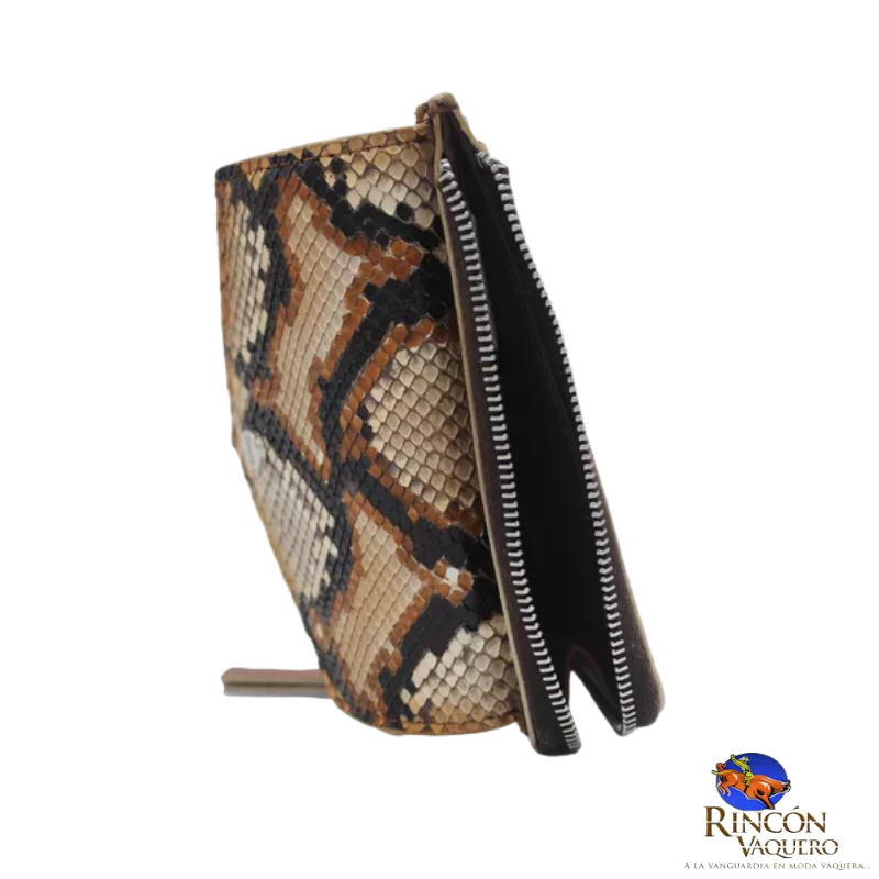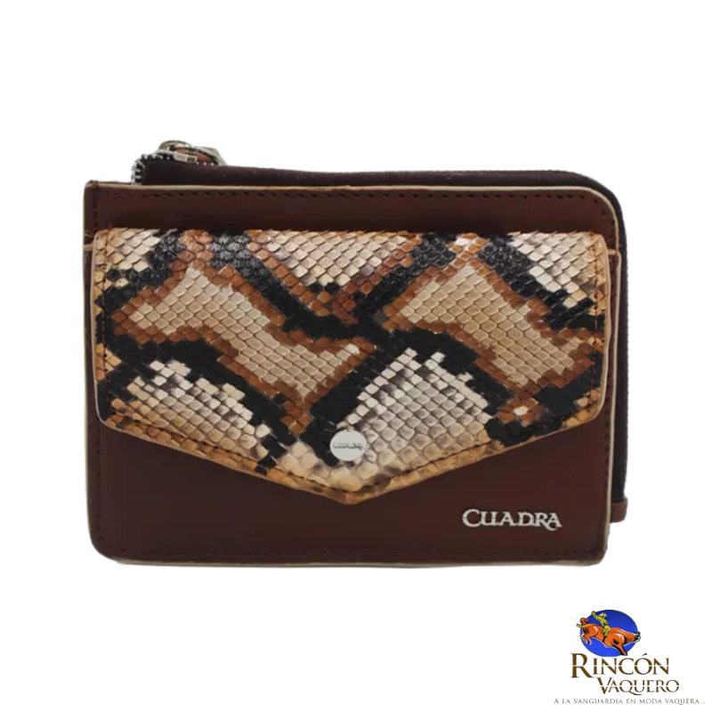 Billetera para dama en piel genuina de pitón y piel de bovino. Al frente presenta una aplicación metálica de logotipo Cuadra. Cuenta con dos compartimentos: uno asegurado con cierre y uno en forma de sobre asegurado con broche de presión. En la parte trasera cuenta con cuatro espacios para tarjetas.
