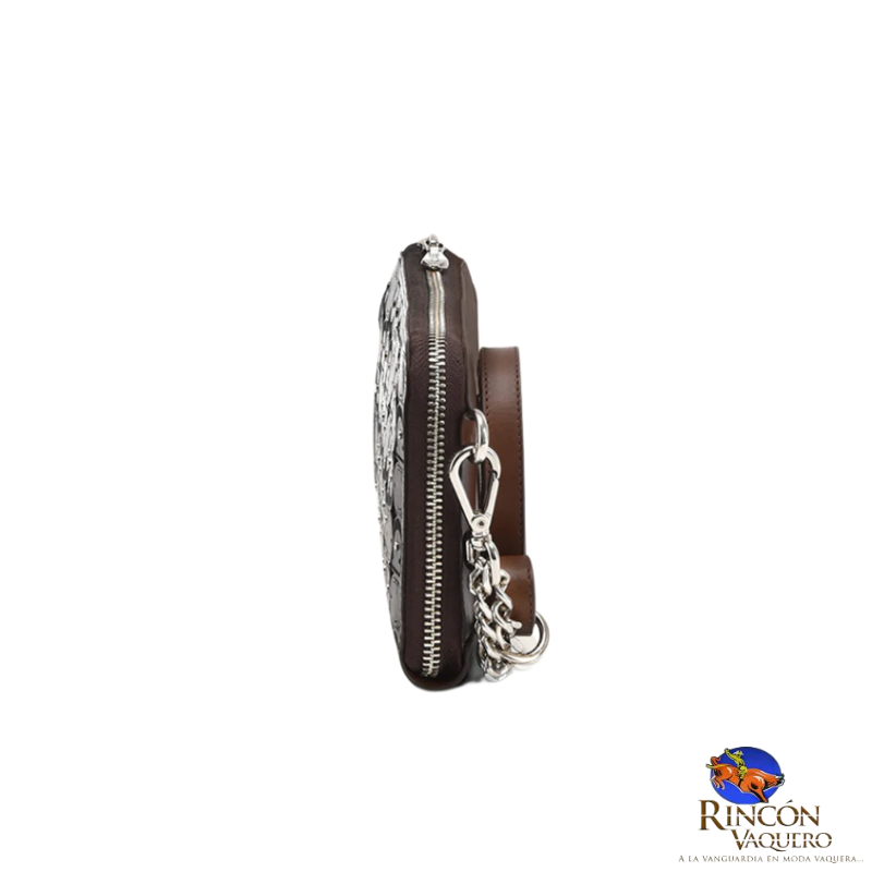 Cartera para dama en piel genuina. Con perforado y grabado láser. Cuenta con pequeños estoperoles metálicos y aplicación con logotipo Cuadra. Asegurado con cierre. Asa en piel de bovino desmontable y ajustable. La parte interna cuenta con cuatro espacios para efectivo, ocho espacios para tarjetas y un monedero con cierre. Color miel.