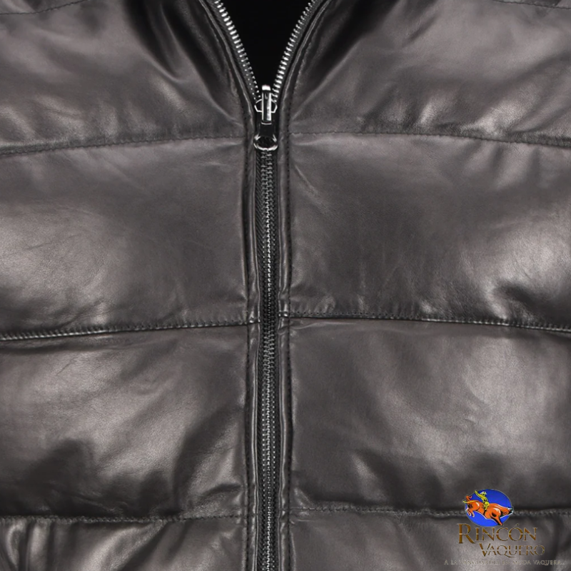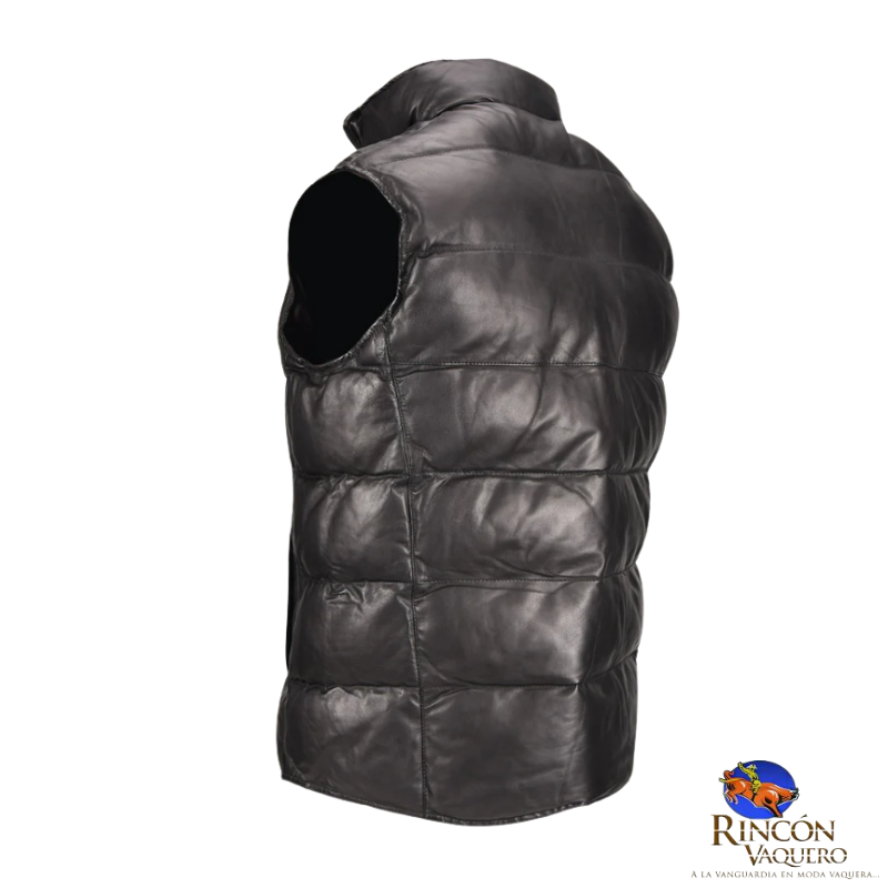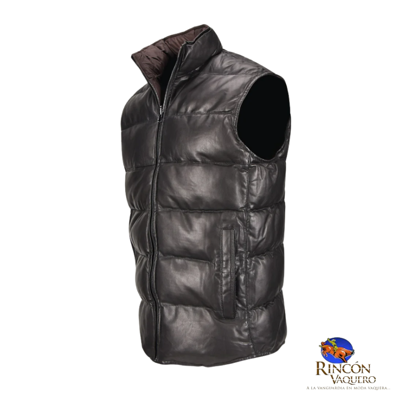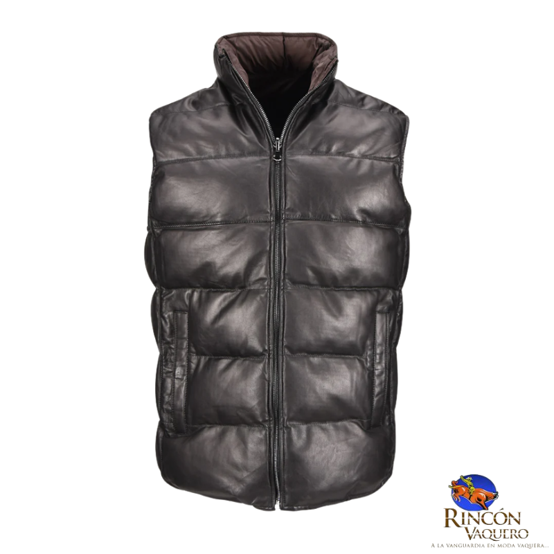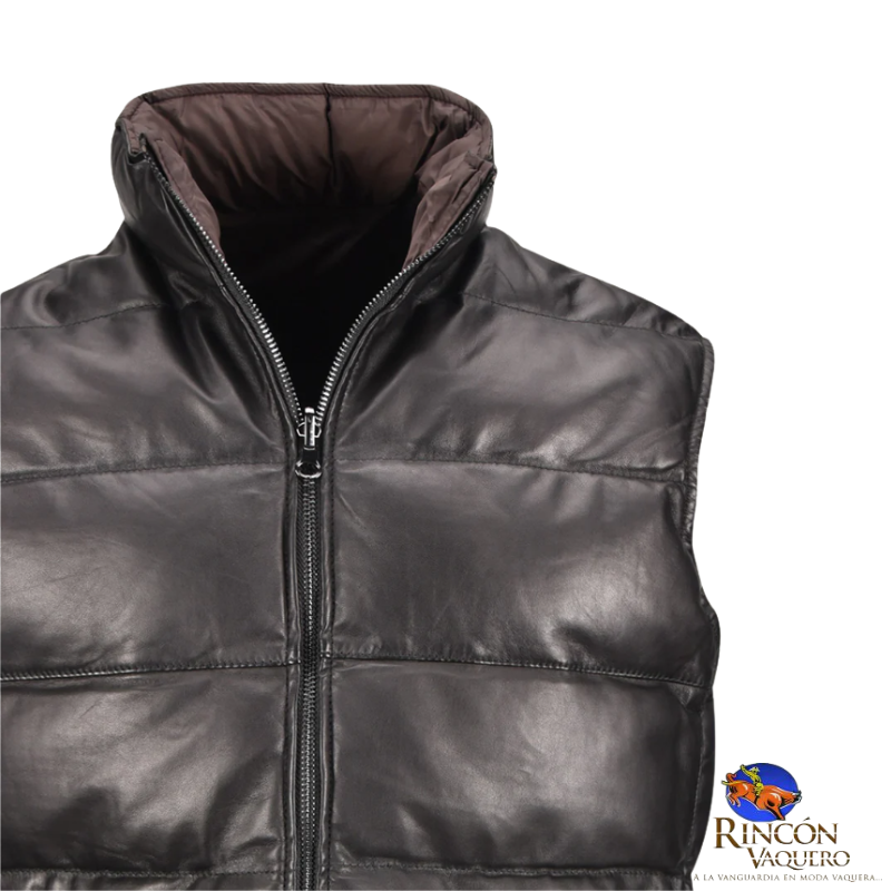 Chaleco reversible para caballero en piel genuina de ovino. La vista principal con acolchado. Cuenta con dos bolsillos asegurados con broche. La segunda vista con textil y dos bolsillos laterales. Ajuste por medio de cierre.