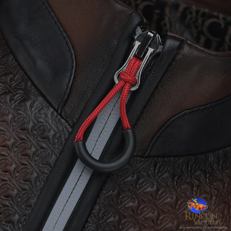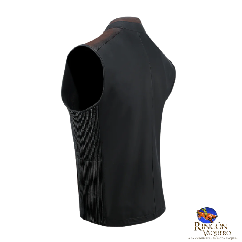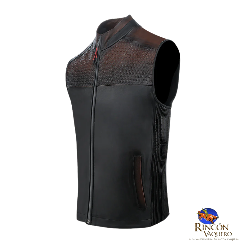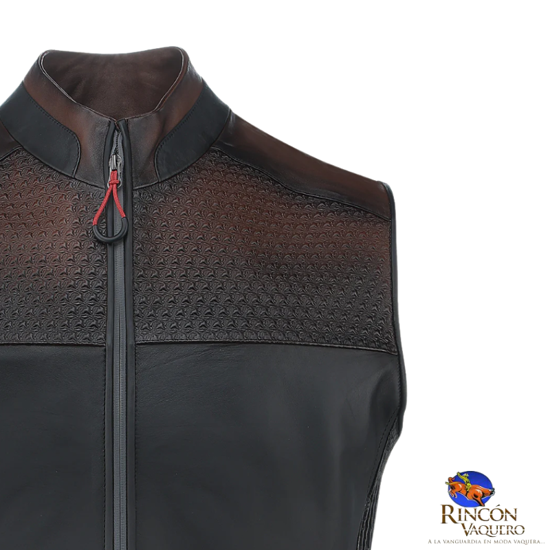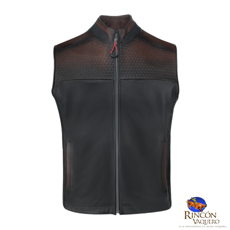 Chaleco para caballero en piel genuina de ovino. Con bordado capitonado y aplicaciones textiles en los hombros, espalda y costados. Cuenta con dos bolsillos laterales y dos bolsillos internos. Ajustado con cierre frontal.