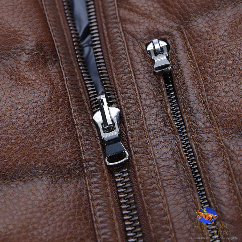 Chaleco reversible para caballero en piel genuina de ovino y textil en la segunda vista. Con bordado capitonado. Cuenta con dos bolsillos laterales y uno en el área del pecho asegurado con cierre. Ajustado con cierre frontal. Color miel y azul