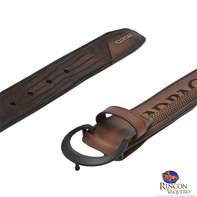 Cinturón casual para caballero en piel genuina de lizard en la punta. Con perforado y grabado del logotipo de la marca a lo largo de la tira. Presenta hebilla en acabado mate de 38mm personalizada con el logo de la marca. Forro en piel genuina de bovino. Color café.
