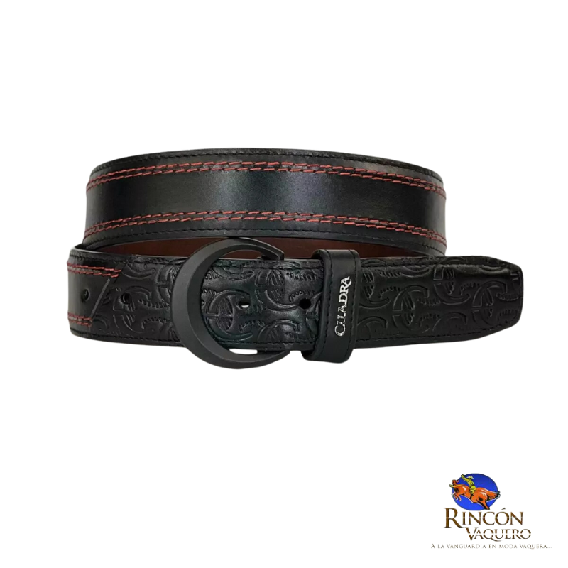 Cinturón vaquero para caballero en piel de res, detalles con relieve y hebilla forrada con sutil grabado de logotipo Cuadra con tejido a lo largo de la tira y herraje de monograma Cuadra.